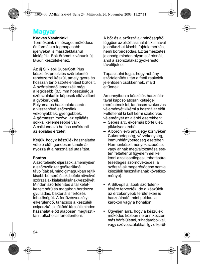 5303400_AMEE_S.6-64 Seite 24 Mittwoch, 26. November 2003 11:27 11 Magyar Kedves Vásárlónk! Termékeink minŒsége, mıködése és formája a legmagasabb igényeket is maradéktalanul kielégítik. Sok örömet kivánunk új Braun készülékéhez. Az új Silk·épil SuperSoft Plus készülék precíziós szŒrtelenítŒ rendszerrel készül, amely gyors és hosszan tartó szŒrtelenítést biztosít. A szŒrtelenítŒ lemezkék még a legkisebb (0,5 mm hosszúságú) szŒrszálakat is képesek eltávolítani a gyökerüknél. Folyamatos használata során a visszanövŒ szŒrszálak vékonyabbak, gyengébbek. A görmasszírozóval az epilálás sokkal kellemesebbé válik. A csiklandozó hatása csökkenti az epilálás érzetét. Kérjük, hogy a készülék használatba vétele elŒtt gondosan tanulmányozza át a használati utasítást. Fontos A szŒrtelenítŒ eljárások, amennyiben a szŒrszálakat gyökerüknél távolítják el, mindig magukban rejtik kisebb bŒrsérülések, befelé növekvŒ szŒrszálak kialakulásának veszélyét. Minden szŒrtelenítés által keletkezett sérülés magában hordozza gyulladás, bakteriális fertŒzés lehetŒségét. A fertŒzésveszélyt elkerülendŒ, tanácsos a készülék csipeszként mıködŒ tárcsáit minden használat elŒtt alaposan megtisztítani, alkohollal fertŒtleníteni.