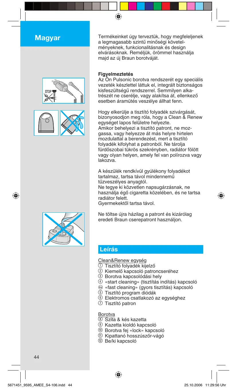 Magyar STOP Termékeinket úgy terveztük, hogy megfeleljenek a legmagasabb szintı minŒségi követelményeknek, funkcionalitásnak és design elvárásoknak. Reméljük, örömmel használja majd az új Braun borotváját. Figyelmeztetés Az Ön Pulsonic borotva rendszerét egy speciális vezeték készlettel láttuk el, integrált biztonságos kisfeszültségı rendszerrel. Semmilyen alkatrészét ne cserélje, vagy alakítsa át, ellenkezŒ esetben áramütés veszélye állhat fenn. Hogy elkerülje a tisztító folyadék szivárgását, bizonyosodjon meg róla, hogy a Clean & Renew egységet lapos felületre helyezte. Amikor behelyezi a tisztító patront, ne mozgassa, vagy helyezze át más helyre hirtelen mozdulattal a berendezést, mert a tisztító folyadék kifolyhat a patronból. Ne tárolja fürdŒszobai tükrös szekrényben, radiátor fölött vagy olyan helyen, amely fel van polírozva vagy lakozva. A készülék rendkívül gyúlékony folyadékot tartalmaz, tartsa távol mindennemı tızveszélyes anyagtól. Ne tegye ki közvetlen napsugárzásnak, ne használja égŒ cigaretta közelében, és ne tartsa radiátor felett. GyermekektŒl tartsa távol. Ne töltse újra házilag a patront és kizárólag eredeti Braun cserepatront használjon. Leírás Clean&Renew egység 1 Tisztító folyadék kijelzŒ 2 KiemelŒ kapcsoló patroncseréhez 3 Borotva kapcsolódási hely 4 «start cleaning» (tisztítás indítás) kapcsoló D «fast cleaning» (gyors tisztítás) kapcsoló 5 Tisztító program diódák 6 Elektromos csatlakozó az egységhez 7 Tisztító patron Borotva 8 Szita & kés kazetta 9 Kazetta kioldó kapcsoló 0 Borotva fej «lock» kapcsoló q Kipattanó hosszúszŒr-vágó w Be/ki kapcsoló