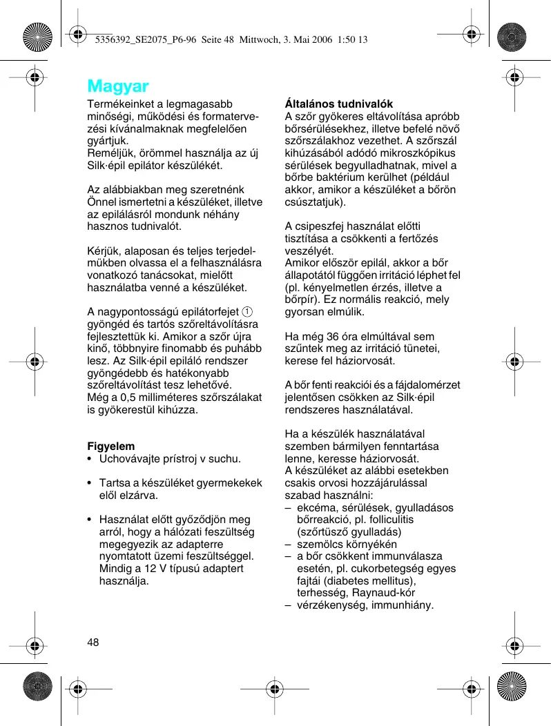 5356392_SE2075_P6-96 Seite 48 Mittwoch, 3. Mai 2006 1:50 13 Magyar Termékeinket a legmagasabb minŒségi, mıködési és formatervezési kívánalmaknak megfelelŒen gyártjuk. Reméljük, örömmel használja az új Silk·épil epilátor készülékét. Az alábbiakban meg szeretnénk Önnel ismertetni a készüléket, illetve az epilálásról mondunk néhány hasznos tudnivalót. Kérjük, alaposan és teljes terjedelmükben olvassa el a felhasználásra vonatkozó tanácsokat, mielŒtt használatba venné a készüléket. A nagypontosságú epilátorfejet 1 gyöngéd és tartós szŒreltávolításra fejlesztettük ki. Amikor a szŒr újra kinŒ, többnyire finomabb és puhább lesz. Az Silk·épil epiláló rendszer gyöngédebb és hatékonyabb szŒreltávolítást tesz lehetŒvé. Még a 0,5 milliméteres szŒrszálakat is gyökerestül kihúzza. Figyelem
