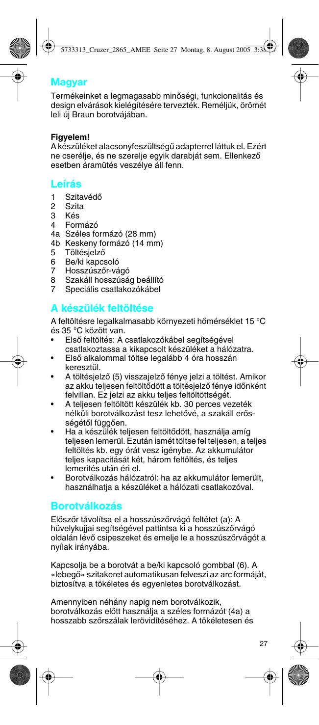 Ha a keszülék teljesen feltoltódott, használáj amig teljesen lemerül. Ezután ismét tõltse fel teljesen, a teljes feltöltés kb. égy orát vesz igenybe. Az akkumulator teljes kapacíasat két, három feltöltés, és teljes lemerítés után éri el. - Borotválkozás hálózatról: ha az akkumulátor lemerült, használhatja a készüléket a hálózati csatlakozóval.
