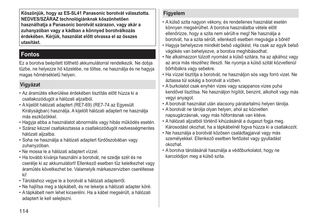 Köszönjük, hogy az ES‑SL41 Panasonic borotvát választotta. NEDVES/SZÁRAZ technológiánknak köszönhetően használhatja a Panasonic borotvát szárazon, vagy akár a zuhanyzóban vagy a kádban a könnyed borotválkozás érdekében. Kérjük, használat előtt olvassa el az összes utasítást.