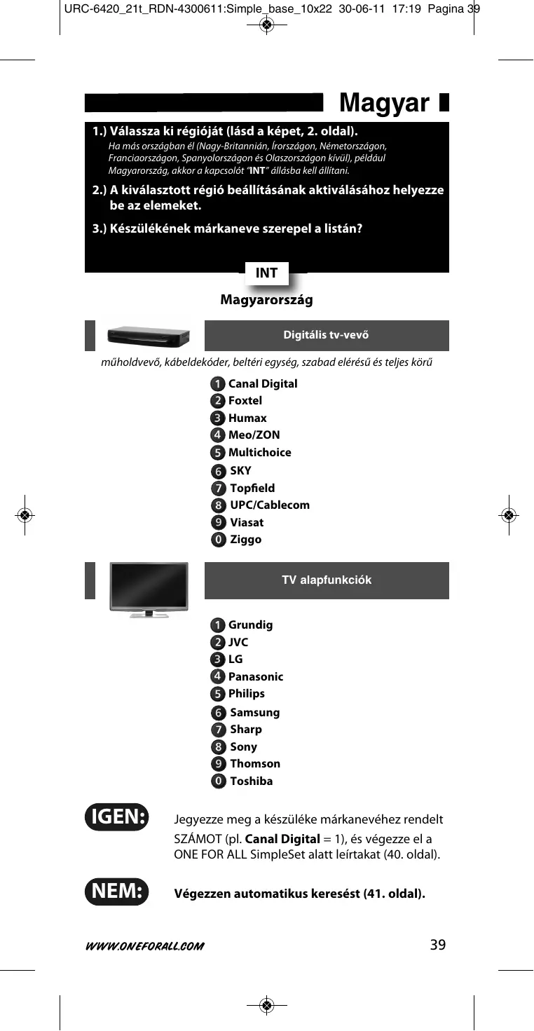 A ONE FOR ALL tvvezérlô nem müküdik megfelel‘en? Lehetséges, hogy létezik jobb bedllitäs készüléke märkanevéhez. Ismételje meg az auto-