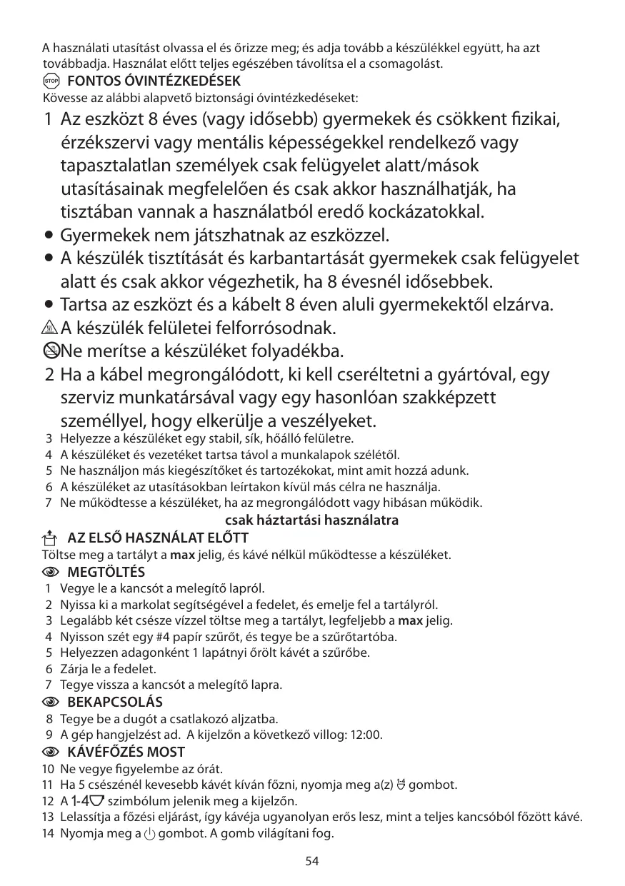 1 Az eszközt 8 éves (vagy idősebb) gyermekek és csökkent fizikai, érzékszervi vagy mentális képességekkel rendelkező vagy tapasztalatlan személyek csak felügyelet alatt/mások utasításainak megfelelően és csak akkor használhatják, ha tisztában vannak a használatból eredő kockázatokkal. • Gyermekek nem játszhatnak az eszközzel. • A készülék tisztítását és karbantartását gyermekek csak felügyelet alatt és csak akkor végezhetik, ha 8 évesnél idősebbek. • Tartsa az eszközt és a kábelt 8 éven aluli gyermekektől elzárva. h A készülék felületei felforrósodnak. lNe merítse a készüléket folyadékba. 2 Ha a kábel megrongálódott, ki kell cseréltetni a gyártóval, egy szerviz munkatársával vagy egy hasonlóan szakképzett személlyel, hogy elkerülje a veszélyeket. 3 4 5 6 7