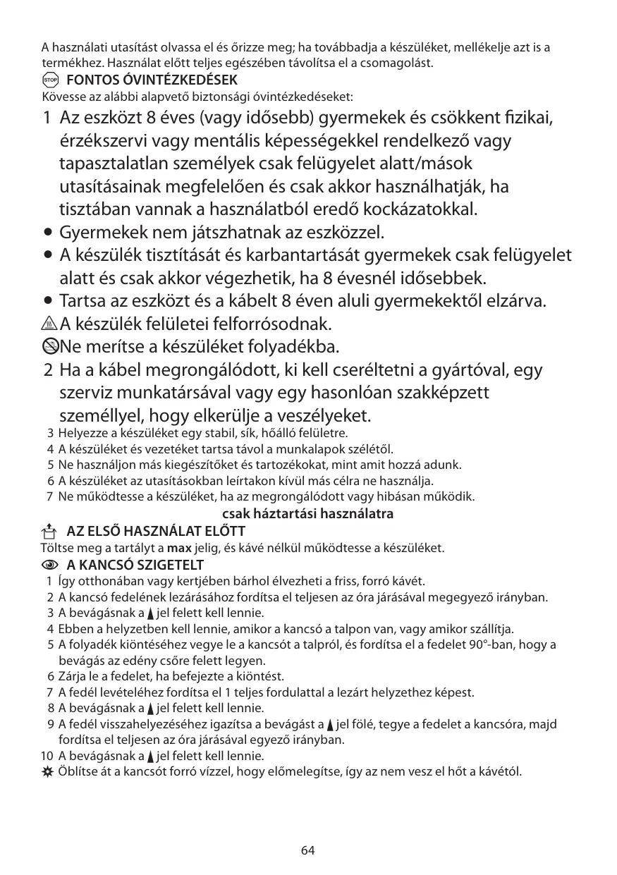 csak háztartási használatra U AZ ELSŐ HASZNÁLAT ELŐTT Töltse meg a tartályt a max jelig, és kávé nélkül működtesse a készüléket.