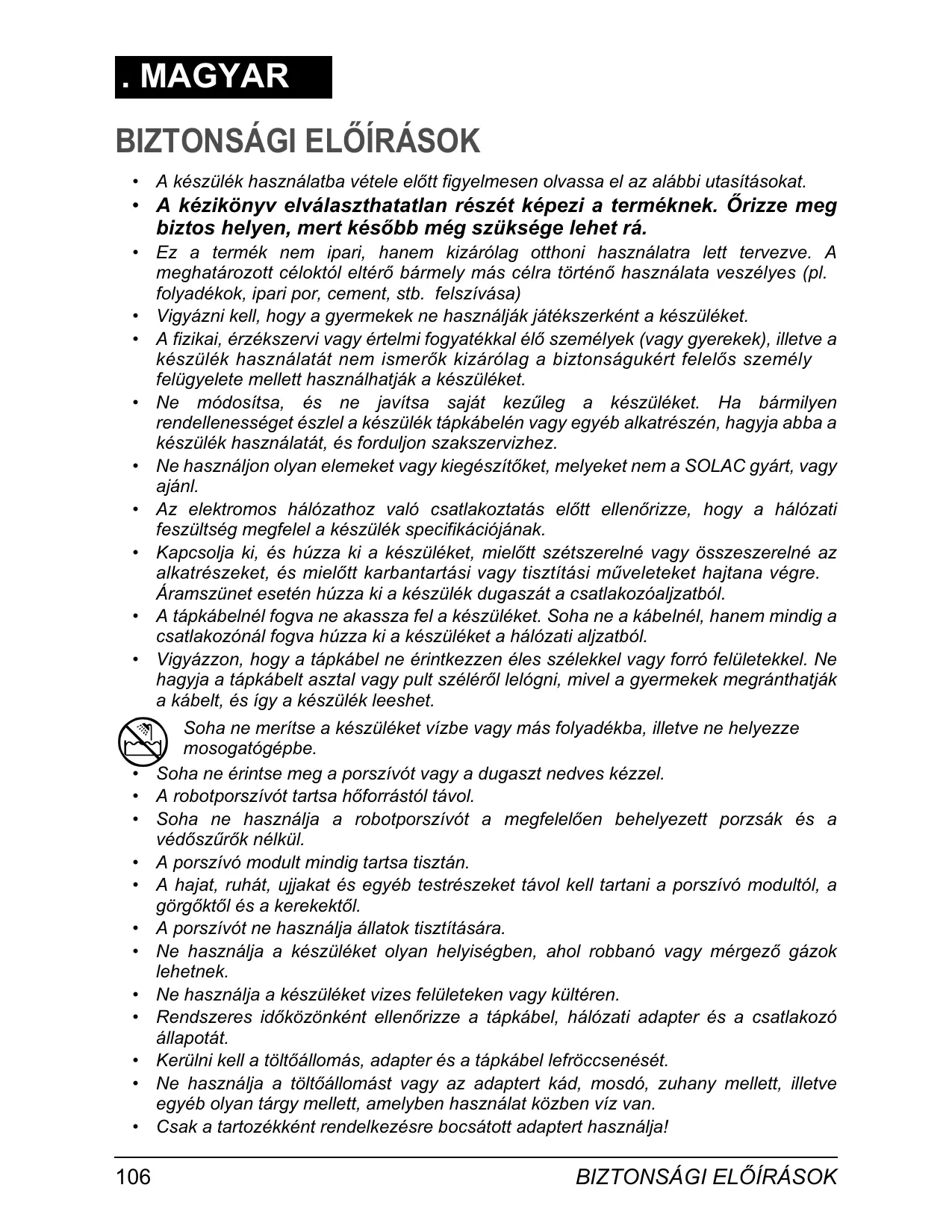 Soha ne merítse a készüléket vízbe vagy más folyadékba, illetve ne helyezze mosogatógépbe. Soha ne érintse meg a porszívót vagy a dugaszt nedves kézzel. A robotporszívót tartsa hforrástól távol. Soha ne használja a robotporszívót a megfelelen behelyezett porzsák és a védszrk nélkül. A porszívó modult mindig tartsa tisztán. A hajat, ruhát, ujjakat és egyéb testrészeket távol kell tartani a porszívó modultól, a görgktl és a kerekektl. A porszívót ne használja állatok tisztítására. Ne használja a készüléket olyan helyiségben, ahol robbanó vagy mérgez gázok lehetnek. Ne használja a készüléket vizes felületeken vagy kültéren. Rendszeres idközönként ellenrizze a tápkábel, hálózati adapter és a csatlakozó állapotát. Kerülni kell a töltállomás, adapter és a tápkábel lefröccsenését. Ne használja a töltállomást vagy az adaptert kád, mosdó, zuhany mellett, illetve egyéb olyan tárgy mellett, amelyben használat közben víz van. Csak a tartozékként rendelkezésre bocsátott adaptert használja!