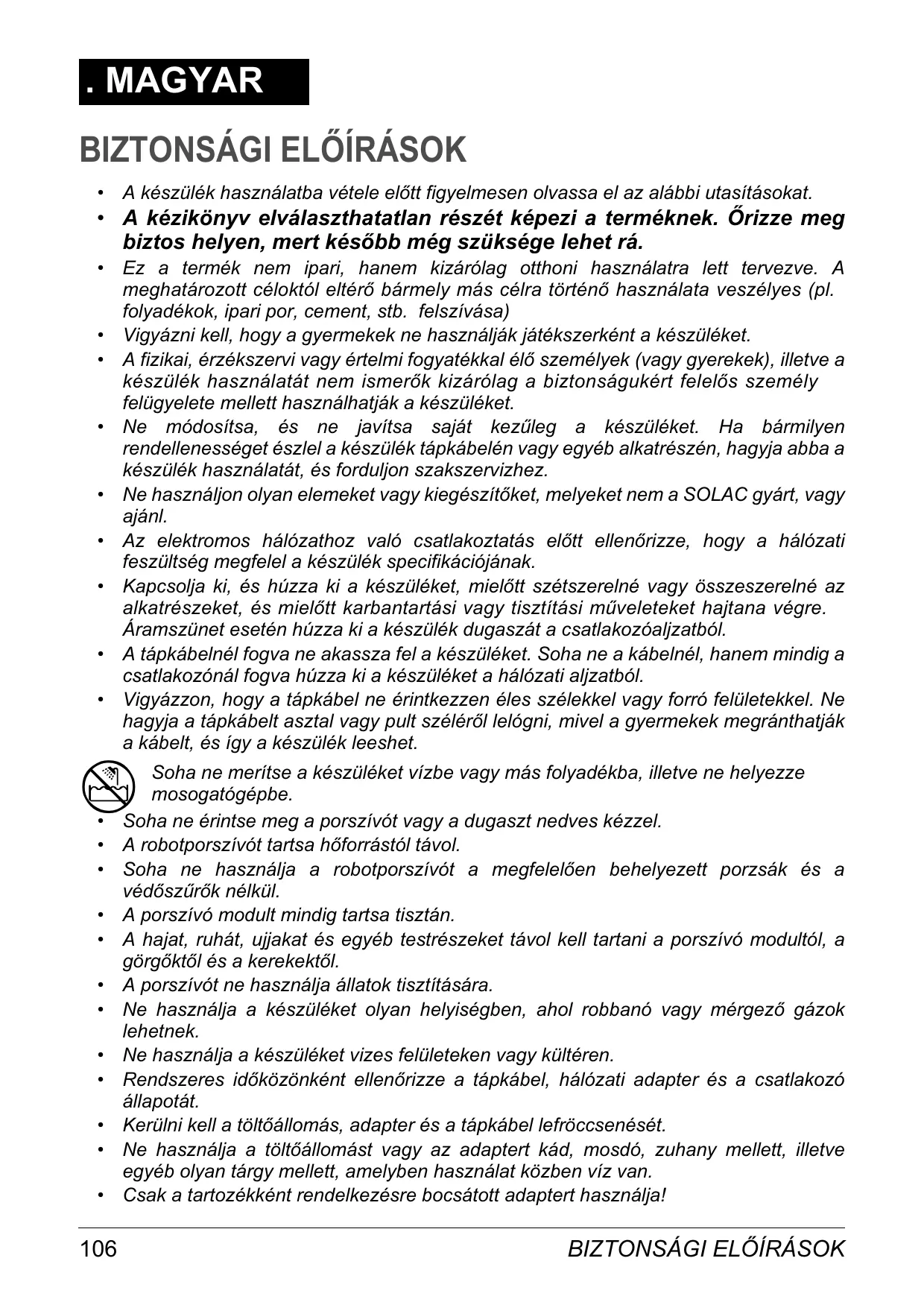 Soha ne merítse a készüléket vízbe vagy más folyadékba, illetve ne helyezze mosogatógépbe. Soha ne érintse meg a porszívót vagy a dugaszt nedves kézzel. A robotporszívót tartsa hforrástól távol. Soha ne használja a robotporszívót a megfelelen behelyezett porzsák és a védszrk nélkül. A porszívó modult mindig tartsa tisztán. A hajat, ruhát, ujjakat és egyéb testrészeket távol kell tartani a porszívó modultól, a görgktl és a kerekektl. A porszívót ne használja állatok tisztítására. Ne használja a készüléket olyan helyiségben, ahol robbanó vagy mérgez gázok lehetnek. Ne használja a készüléket vizes felületeken vagy kültéren. Rendszeres idközönként ellenrizze a tápkábel, hálózati adapter és a csatlakozó állapotát. Kerülni kell a töltállomás, adapter és a tápkábel lefröccsenését. Ne használja a töltállomást vagy az adaptert kád, mosdó, zuhany mellett, illetve egyéb olyan tárgy mellett, amelyben használat közben víz van. Csak a tartozékként rendelkezésre bocsátott adaptert használja!
