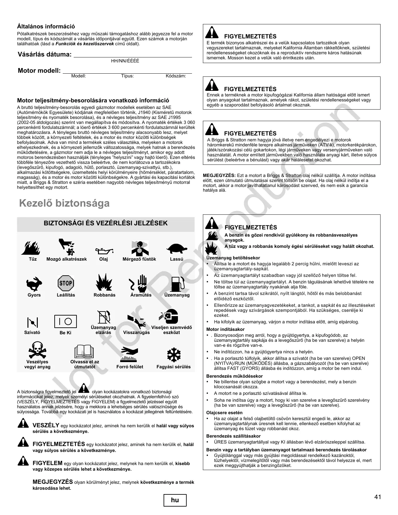 À FIGYELMEZTETÉS E termék bizonyos alkatrészei és a velük kapcsolatos tartozékok olyan vegyszereket tartalmaznak, melyeket Kalifomia Allamban rékkeltôknek, születési rendellenességeket okozéknak és a reproduktiv rendszerre käros hatäsünak ismernek. Mosson kezet a velük valé érintkezés utän. À FIGYELMEZTETÉS Ennek a terméknek a motor kipufogégäzai Kalifornia llam hatésägai elôtt ismert olyan anyagokat tartalmaznak, amelyek räkot, születési rendellenességeket vagy egyéb a szaporodäst befolyäsol értalmat okoznak. À FIGYELMEZTETÉS A Briggs & Stratton nem hagyja jévé illetve nem engedélyezi e motorok hâromkerekü mindenféle terepre alkalmas jérmüveken (ATV-k), motorkerékpärokon, jéték/szôrakozési célü gokartokon, légi jrmüveken vagy versenyjrmüveken valé hasznälatät. À motor emlitett jrmüvekben valé hasznälata anyagi kärt, iletve sülyos sérülést (beleértve a bénulést) vagy akér halälesetet.okozhat. MEGJEGYZÉS: Ezt a motort a Briggs & Stratton olaj nélkül szällja. À motor inditésa elôtt, ezen dtmutaté ütmutatäsai szerint tôltsôn be olajat. Ha olaj nélkül inditja el a motort, akkor a motor javithatatianul kérosodést szenved, és nem esik a garancia hatälya alé. FIGYELMEZTETÉS À benzin és gôzei rendkivül gyülékony és robbanäsveszélyes anyagok. Atüz vagy a robbanäs komoly égési sérüléseket vagy halält okozhat. Üzemanyag betôltésekor