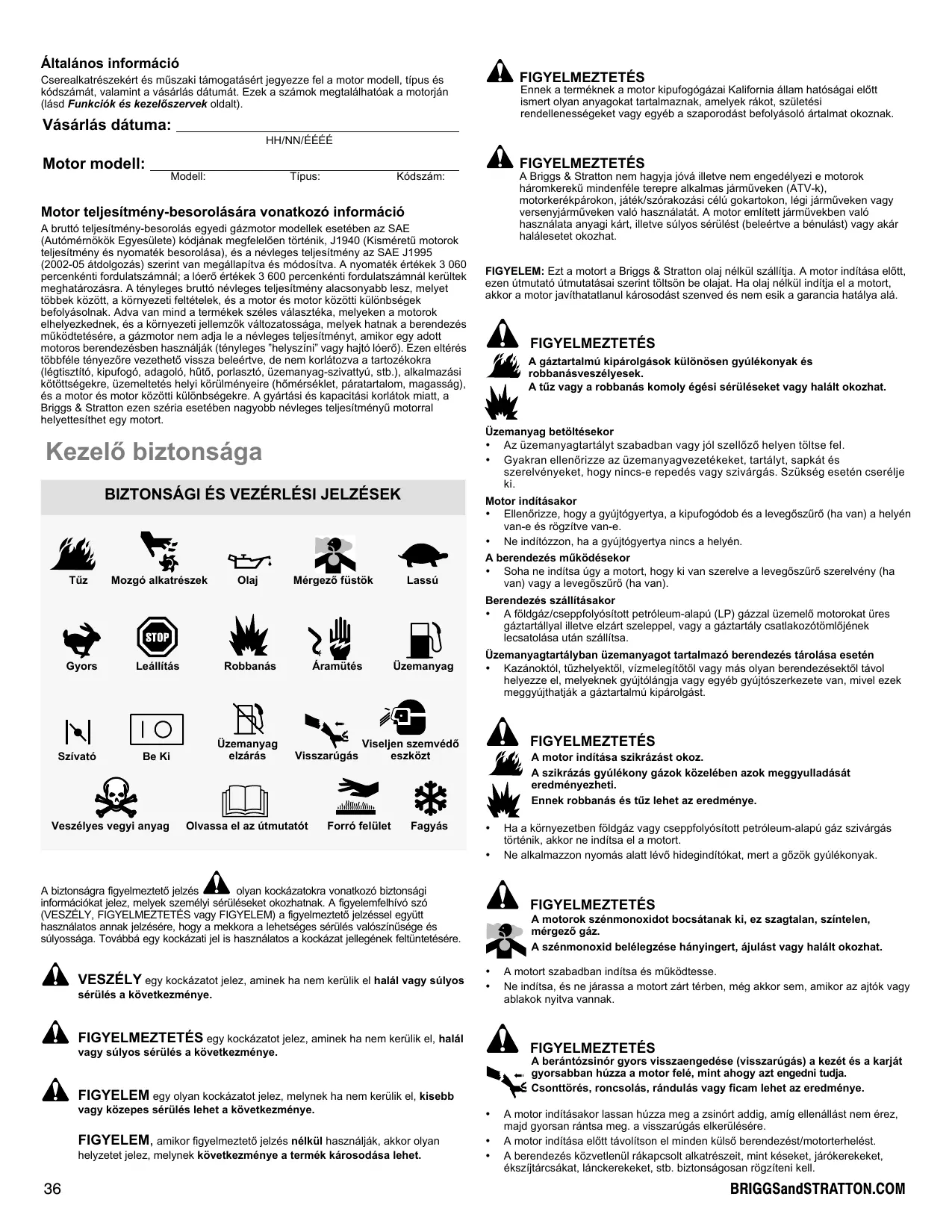 Âltalänos informäcié Cserealkatrészekért és müszaki tamogatäsért jegyezze fel a motor model, tipus és kédszämät, valamint a väsärläs dâtumät. Ezek a szämok megtallhatéak a motorjän (läsd Funkciék és kezelszervek oldalt). Väsärläs dâtuma: HH/NN/ÉÉÉÉ Motor modell: Model: Tipus: Kodszäm: Motor teljesitmény-besoroläsära vonatkozé informäcié A brutté teljesitmény-besoroläs egyedi gäzmotor modellek esetében az SAE (Autémémôkôk Egyesülete) kédjänak megfeleléen tôrténik, J1940 (Kisméretü motorok teljesitmény és nyomaték besorolésa), és a névleges teljesitmény az SAË J1995 (2002-05 âtdolgozés) szerint van megällapitva és médositva. À nyomaték értékek 3 060 percenkénti fordulatszmnäl: a l6er6 értékek 3 600 percenkénti fordulatszämnäl kerültek meghatärozésra. À tényleges brutté névleges teljesitmény alacsonyabb lesz, melyet tôbbek kôzôtt, a kômyezeti feltételek, és a motor és motor kôzôti külônbségek befolyäsoinak. Adva van mind a termékek széles välasztéka, melyeken a motorok elhelyezkednek, és a kümyezetijellemzôk vältozatossäga, melyek hatnak a berendezés mükôdtetésére, a gâzmotor nem adja le a névleges teljesitményt, amikor egy adott motoros berendezésben hasznäljäk (tényleges "helyszini’ vagy hajté léerë). Ezen eltérés tôbbféle tényezôre vezethet6 vissza beleérive, de nem korltozva a tartozékokra légtisztité, kipufogé, adagolé, hüté, porlaszté, üzemanyag-szivattyü, stb.), alkalmazäsi kütôtségekre, üzemeltetés helyi kôrülményeire (hômérséklet, pératartalom, magassäg), és a motor és motor Kôzôtti külônbségekre. À gyärtäsi és kapacitäsi korlätok miatt, a Briggs & Stratton ezen széria esetében nagyobb névieges teljesitményü motorral helyettesithet egy motort. Kezel6 biztonsäga BIZTONSAGI ÉS VEZÉRLÉSI JELZÉSEK (A 2 ? $ +7 e- Tüz Mozgé alkatrészek Olaj Mérgezé füstôk Lassü Gyors Leällités Robbanäs Âramütés Üzemanyag NI [ro N « = Üzemanyag v Viseljen szemvédé Szivaté Be Ki elzäräs Visszarügäs eszkôzt ali, + Veszélyes vegyi anyag Olvassaelazütmutatét Forréfelület Fagyäs A biztonsägra figyelmezteté jeizés À olyan kockäzatokra vonatkozé biztonsägi informéciôkat jelez, melyek személyi sérüléseket okozhatnak. À figyelemfelhivé sz6 (VESZÉLY, FIGYELMEZTETÉS vagy FIGYELEM) a figyelmeztet jelzéssel együtt hasznélatos annak jelzésére, hogy a mekkora a lehetsèges sérülés valészinüsége és sülyossäga. Tovébbé egy kockézat jel is hasznélatos a kockäzat ellegének feltüntetésére. À VESZÉLY egy kockäzatot jelez, aminek ha nem kerülik el haläl vagy sülyos sérülés a kôvetkezménye. PIN FIGYELMEZTETÉS egy kockäzatot jelez, aminek ha nem kerülik el, hall vagy sülyos sérülés a kôvetkezménye. FIGYELEM egy olyan kockäzatot jelez, melynek ha nem kerülik el, kisebb vagy kôzepes sérülés lehet a kôvetkezménye. FIGYELEM, amikor figyelmezteté jelzés nélkül hasznäljäk, akkor olyan helyzetet jelez, melynek kôvetkezménye a termék kérosodäsa lehet.