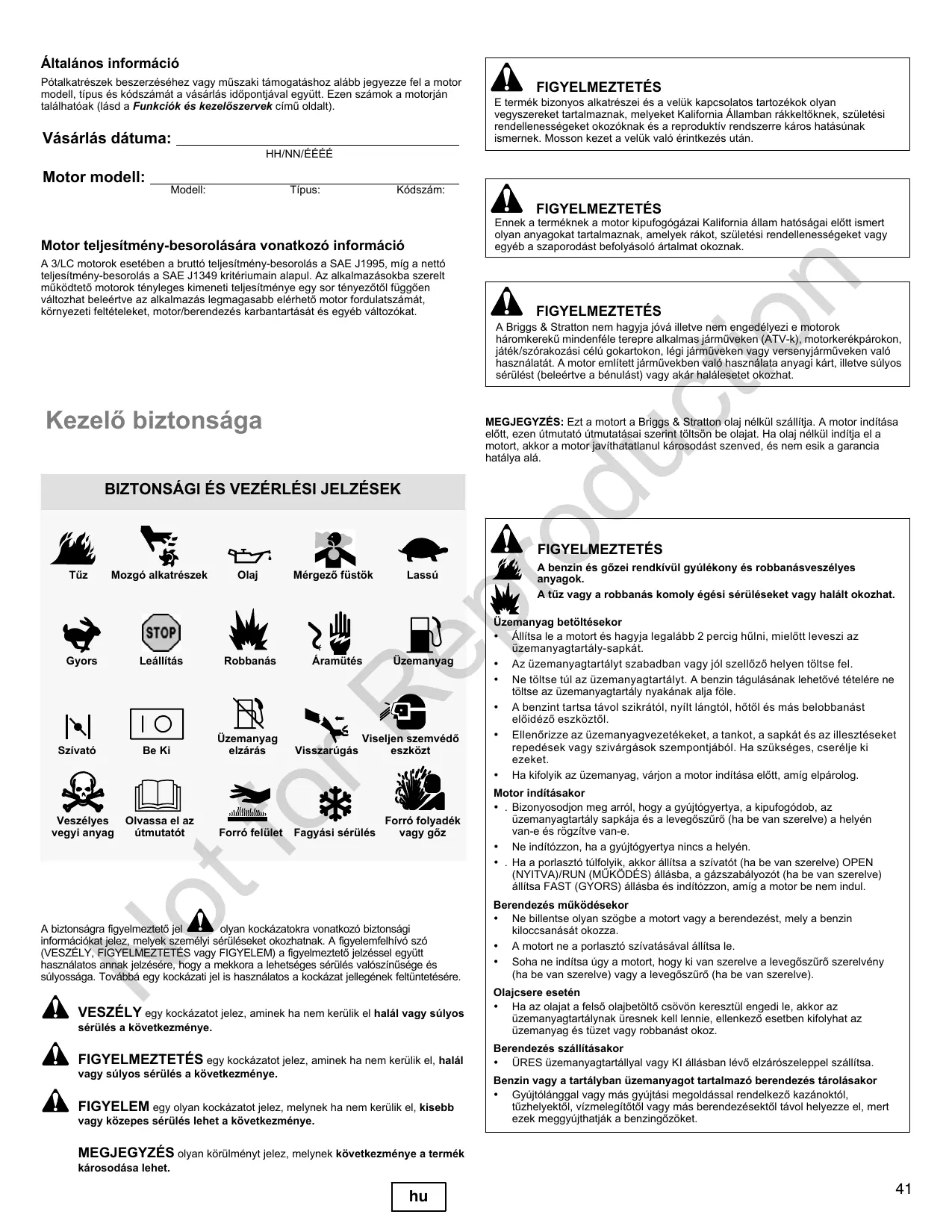 À FIGYELMEZTETÉS E termék bizonyos alkatrészei és a velük kapcsolatos tartozékok olyan vegyszereket tartalmaznak, melyeket Kalifomia Allamban rékkeltôknek, születési rendellenességeket okozéknak és a reproduktiv rendszerre käros hatäsünak ismernek. Mosson kezet a velük valé érintkezés utän. À FIGYELMEZTETÉS Ennek a terméknek a motor kipufogégäzai Kalifornia llam hatésägai elôtt ismert olyan anyagokat tartalmaznak, amelyek räkot, születési rendellenességeket vagy egyéb a szaporodäst befolyäsol értalmat okoznak. À FIGYELMEZTETÉS A Briggs & Stratton nem hagyja jévé illetve nem engedélyezi e motorok häromkerekü mindenféle terepre alkalmas jérmüveken (ATV-k), motorkerékpärokon, jéték/szôrakozési célü gokartokon, légi jrmüveken vagy versenyjrmüveken valé hasznälatät. À motor emlitett jrmüvekben val hasznélata anyagi kärt, iletve sülyos sérülést (beleértve a bénulést) vagy akär halälesetet okozhat. MEGJEGYZÉS: Ezt a motor a Briggs & Stratton olaj nélkül szällifja. À motor inditäsa elôtt, ezen ütmutaté ütmutatäsai szerint tôltsôn be olajat. Ha olaj nélkül inditja el a motort, akkor a motor javithatatlanul krosodést szenved, és nem esik a garancia hatälya alé. FIGYELMEZTETÉS À benzin és gôzei rendkivül gyülékony és robbanäsveszélyes anyagok. A tüz vagy a robbanäs komoly égési sérüléseket vagy halält okozhat. Üzemanyag betôltésekor + _Âllitsa le a motort és hagyja legaläbb 2 percig hülni, mielôtt leveszi az üzemanyagtartäly-sapkät. + Az üzemanyagtartälyt szabadban vagy jél szellézô helyen téltse fel. + Ne téltse tül az üzemanyagtartälyt. À benzin tâguläsänak lehetôvé tételére ne tôltse az üzemanyagtartäly nyakänak alja fôle. + A benzint tartsa tâvol szikrätél, nyilt längtél, hôtôl és mâs belobbanäst eléidézé eszkôztél + Ellenôrizze az üzemanyagvezetékeket, a tankot, a sapkät és az illesztéseket repedések vagy szivérgäsok szempontjäbôl. Ha szükséges, cserélje ki ezeket. + Ha kifolyik az üzemanyag, värjon a motor inditäsa elôtt, amig elpärolog. Motor inditäsakor +. Bizonyosodjon meg arrôl, hogy a gyüjtégyertya, a kipufogédob, az üzemanyagtartäly sapkäja és a levegészüré (ha be van szerelve) a helyén van-e és rôgzitve van-e. + Ne inditézzon, ha a gyüjtégyertya nincs a helyén. +_. Ha a porlaszté tülfolyik, akkor ällitsa a szivatét (ha be van szerelve) OPEN {NYITVA)/RUN (MÜKÔDÉS) ällsba, a gâzszabälyozôt (ha be van szerelve) ällitsa FAST (GYORS) éllésba és inditézzon, amig a motor be nem indul Berendezés mükôdésekor + Ne billentse olyan szôgbe a motort vagy a berendezést, mely a benzin kiloccsanäsät okozza. + A motort ne a porlaszt6 szivatésäval llitsa le. + Soha ne inditsa ügy a motort, hogy ki van szerelve a levegôszüré szerelvény {ha be van szerelve) vagy a levegôszüré (ha be van szerelve) Olajesere esetén + Ha az olajat a felsô olajbetôlté csôvôn keresztül engedi le, akkor az. üzemanyagtartälynak üresnek kell lennie, ellenkezô esetben kifolyhat az üzemanyag és tüzet vagy robbanést okoz. Berendezés szällitésakor + ÜRES üzemanyagtartällyal vagy KI éllésban lév6 elzérészeleppel szälitsa. Benzin vagy a tartélyban üzemanyagot tartalmazé berendezés târolésakor + Gyüitélänggal vagy més gyüitési megoldéssal rendelkezô kazänoktôl, tüzhelyektl, vizmelegitôtôl vagy més berendezésektôl tâvol helyezze el, mert ezek meggyüithaljäk a benzingézüket.