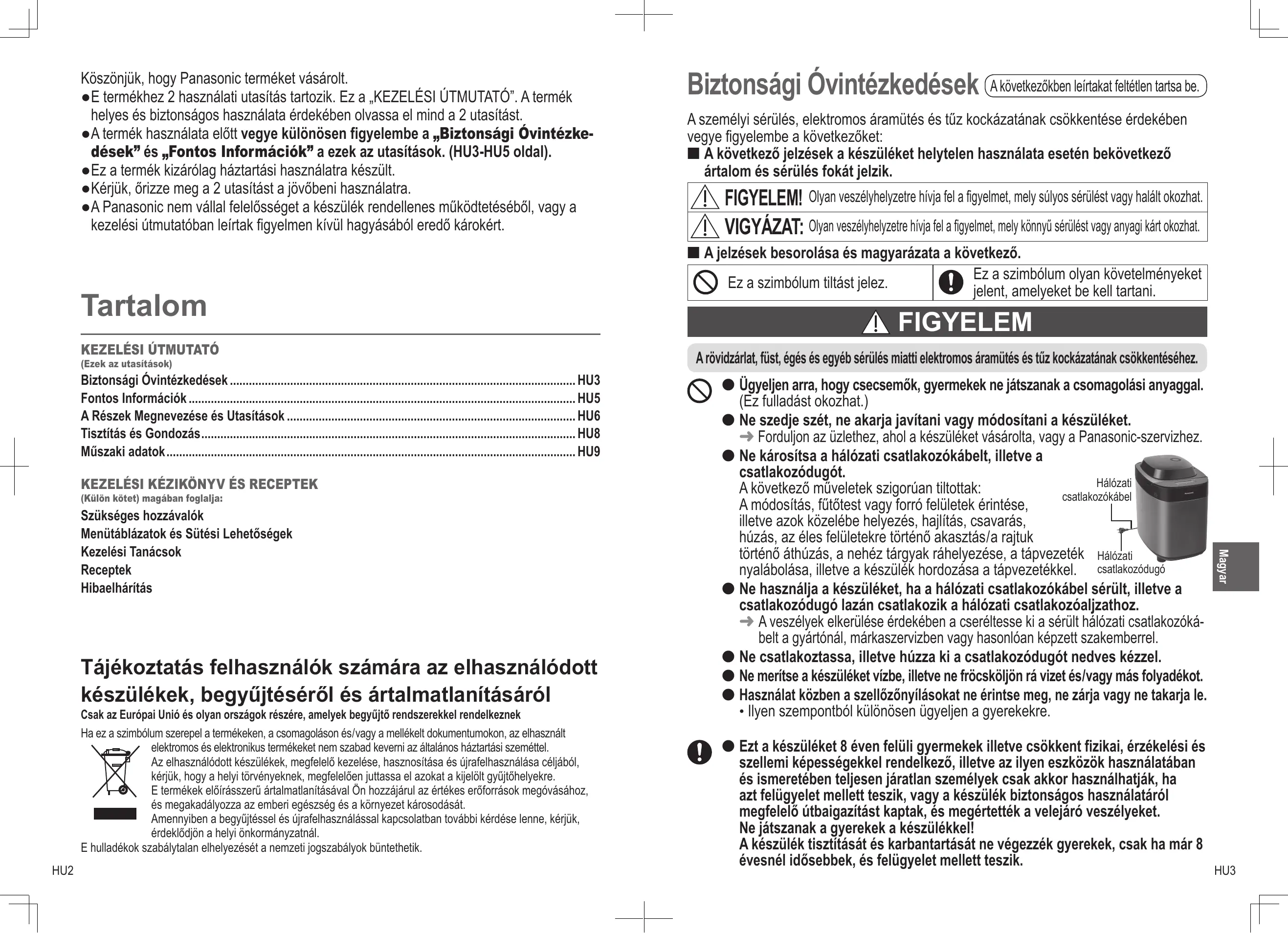 FIGYELEM A rövidzárlat, füst, égés és egyéb sérülés miatti elektromos áramütés és tűz kockázatának csökkentéséhez. l Ügyeljen arra, hogy csecsemők, gyermekek ne játszanak a csomagolási anyaggal. (Ez fulladást okozhat.) l Ne szedje szét, ne akarja javítani vagy módosítani a készüléket. É Forduljon az üzlethez, ahol a készüléket vásárolta, vagy a Panasonic-szervizhez. l Ne károsítsa a hálózati csatlakozókábelt, illetve a csatlakozódugót. Hálózati A következő műveletek szigorúan tiltottak: csatlakozókábel A módosítás, fűtőtest vagy forró felületek érintése, illetve azok közelébe helyezés, hajlítás, csavarás, húzás, az éles felületekre történő akasztás / a rajtuk történő áthúzás, a nehéz tárgyak ráhelyezése, a tápvezeték Hálózati nyalábolása, illetve a készülék hordozása a tápvezetékkel. csatlakozódugó l Ne használja a készüléket, ha a hálózati csatlakozókábel sérült, illetve a csatlakozódugó lazán csatlakozik a hálózati csatlakozóaljzathoz. É A veszélyek elkerülése érdekében a cseréltesse ki a sérült hálózati csatlakozókábelt a gyártónál, márkaszervizben vagy hasonlóan képzett szakemberrel. l Ne csatlakoztassa, illetve húzza ki a csatlakozódugót nedves kézzel. l Ne merítse a készüléket vízbe, illetve ne fröcsköljön rá vizet és/vagy más folyadékot. l Használat közben a szellőzőnyílásokat ne érintse meg, ne zárja vagy ne takarja le. ● Ilyen szempontból különösen ügyeljen a gyerekekre. l Ezt a készüléket 8 éven felüli gyermekek illetve csökkent fizikai, érzékelési és szellemi képességekkel rendelkező, illetve az ilyen eszközök használatában és ismeretében teljesen járatlan személyek csak akkor használhatják, ha azt felügyelet mellett teszik, vagy a készülék biztonságos használatáról megfelelő útbaigazítást kaptak, és megértették a velejáró veszélyeket. Ne játszanak a gyerekek a készülékkel! A készülék tisztítását és karbantartását ne végezzék gyerekek, csak ha már 8 évesnél idősebbek, és felügyelet mellett teszik.