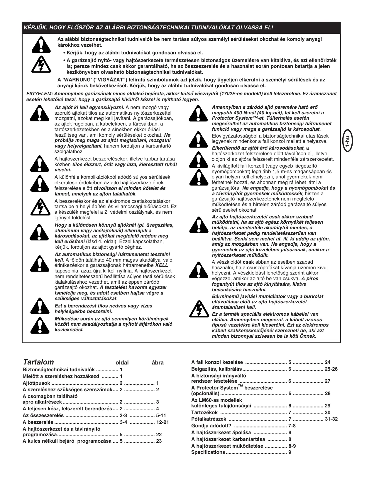 A fali konzol kezelése 5 24 Beigazítás, kalibrálás 6 25-26 A biztonsági irányváltó rendszer tesztelése 6 27 A Protector System™ beszerelése (opcionális) 6 28 Az LM60-as modellek különleges tulajdonságai 6 29 Tartozékok 7 30 Pótalkatrészek 7 31-32 Gondja adódott? 7-8 A hajtószerkezet ápolása 8 A hajtószerkezet karbantartása 8 A hajtószerkezet mıködtetése 8-9 Specifications 9