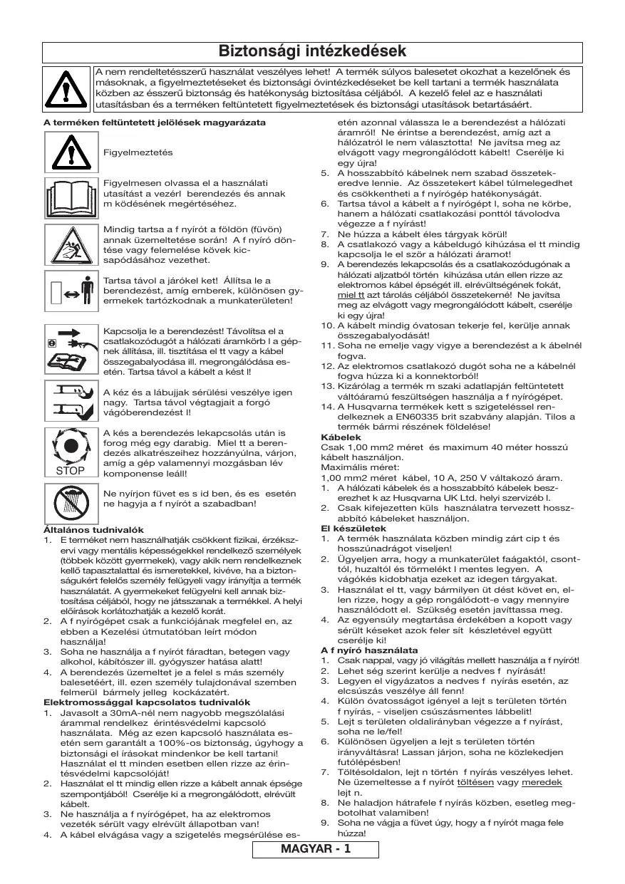 Biztonsági intézkedések A nem rendeltetésszerű használat veszélyes lehet! A termék súlyos balesetet okozhat a kezelőnek és másoknak, a figyelmeztetéseket és biztonsági óvintézkedéseket be kell tartani a termék használata közben az ésszerű biztonság és hatékonyság biztosítása céljából. A kezelő felel az e használati utasításban és a terméken feltüntetett figyelmeztetések és biztonsági utasítások betartásáért. A terméken feltüntetett jelölések magyarázata Figyelmeztetés Figyelmesen olvassa el a használati utasítást a vezérl berendezés és annak m ködésének megértéséhez. Mindig tartsa a f nyírót a földön (füvön) annak üzemeltetése során! A f nyíró döntése vagy felemelése kövek kicsapódásához vezethet. Tartsa távol a járókel ket! Állítsa le a berendezést, amíg emberek, különösen gyermekek tartózkodnak a munkaterületen! Kapcsolja le a berendezést! Távolítsa el a csatlakozódugót a hálózati áramkörb l a gépnek állítása, ill. tisztítása el tt vagy a kábel összegabalyodása ill. megrongálódása esetén. Tartsa távol a kábelt a kést l! A kéz és a lábujjak sérülési veszélye igen nagy. Tartsa távol végtagjait a forgó vágóberendezést l! STOP A kés a berendezés lekapcsolás után is forog még egy darabig. Miel tt a berendezés alkatrészeihez hozzányúlna, várjon, amíg a gép valamennyi mozgásban lév komponense leáll! Ne nyírjon füvet es s id ben, és es esetén ne hagyja a f nyírót a szabadban! Általános tudnivalók