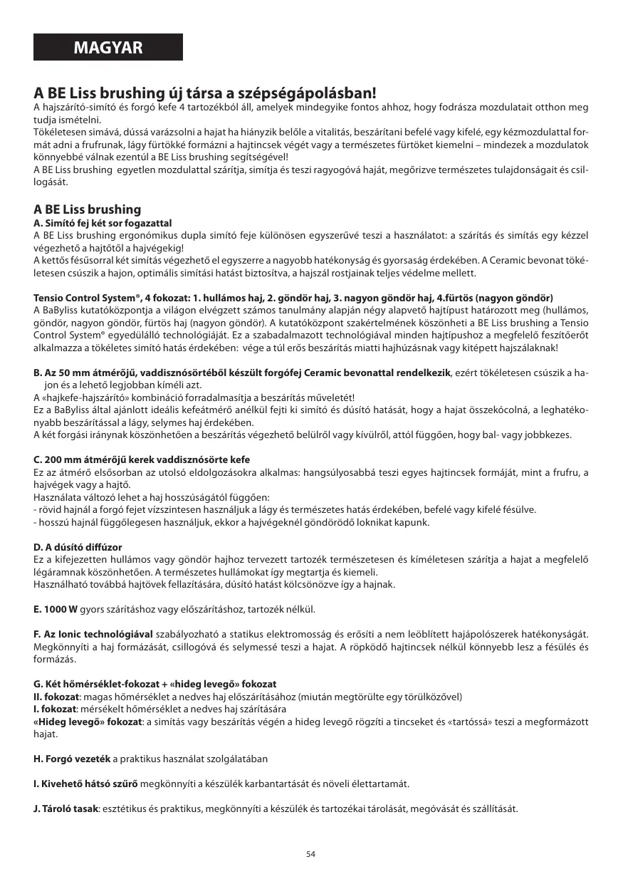 A. Simító fej két sor fogazattal A BE Liss brushing ergonómikus dupla simító feje különösen egyszerűvé teszi a használatot: a szárítás és simítás egy kézzel végezhető a hajtőtől a hajvégekig! A kettős fésűsorral két simítás végezhető el egyszerre a nagyobb hatékonyság és gyorsaság érdekében. A Ceramic bevonat tökéletesen csúszik a hajon, optimális simítási hatást biztosítva, a hajszál rostjainak teljes védelme mellett. Tensio Control System®, 4 fokozat: 1. hullámos haj, 2. göndör haj, 3. nagyon göndör haj, 4.fürtös (nagyon göndör) A BaByliss kutatóközpontja a világon elvégzett számos tanulmány alapján négy alapvető hajtípust határozott meg (hullámos, göndör, nagyon göndör, fürtös haj (nagyon göndör). A kutatóközpont szakértelmének köszönheti a BE Liss brushing a Tensio Control System® egyedülálló technológiáját. Ez a szabadalmazott technológiával minden hajtípushoz a megfelelő feszítőerőt alkalmazza a tökéletes simító hatás érdekében: vége a túl erős beszárítás miatti hajhúzásnak vagy kitépett hajszálaknak! B. Az 50 mm átmérőjű, vaddisznósörtéből készült forgófej Ceramic bevonattal rendelkezik, ezért tökéletesen csúszik a hajon és a lehető legjobban kíméli azt. A «hajkefe-hajszárító» kombináció forradalmasítja a beszárítás műveletét! Ez a BaByliss által ajánlott ideális kefeátmérő anélkül fejti ki simító és dúsító hatását, hogy a hajat összekócolná, a leghatékonyabb beszárítással a lágy, selymes haj érdekében. A két forgási iránynak köszönhetően a beszárítás végezhető belülről vagy kívülről, attól függően, hogy bal- vagy jobbkezes. C. 200 mm átmérőjű kerek vaddisznósörte kefe Ez az átmérő elsősorban az utolsó eldolgozásokra alkalmas: hangsúlyosabbá teszi egyes hajtincsek formáját, mint a frufru, a hajvégek vagy a hajtő. Használata változó lehet a haj hosszúságától függően: - rövid hajnál a forgó fejet vízszintesen használjuk a lágy és természetes hatás érdekében, befelé vagy kifelé fésülve. - hosszú hajnál függőlegesen használjuk, ekkor a hajvégeknél göndörödő loknikat kapunk. D. A dúsító diffúzor Ez a kifejezetten hullámos vagy göndör hajhoz tervezett tartozék természetesen és kíméletesen szárítja a hajat a megfelelő légáramnak köszönhetően. A természetes hullámokat így megtartja és kiemeli. Használható továbbá hajtövek fellazítására, dúsító hatást kölcsönözve így a hajnak. E. 1000 W gyors szárításhoz vagy előszárításhoz, tartozék nélkül. F. Az Ionic technológiával szabályozható a statikus elektromosság és erősíti a nem leöblített hajápolószerek hatékonyságát. Megkönnyíti a haj formázását, csillogóvá és selymessé teszi a hajat. A röpködő hajtincsek nélkül könnyebb lesz a fésülés és formázás. G. Két hőmérséklet-fokozat + «hideg levegő» fokozat II. fokozat: magas hőmérséklet a nedves haj előszárításához (miután megtörülte egy törülközővel) I. fokozat: mérsékelt hőmérséklet a nedves haj szárítására «Hideg levegő» fokozat: a simítás vagy beszárítás végén a hideg levegő rögzíti a tincseket és «tartóssá» teszi a megformázott hajat. H. Forgó vezeték a praktikus használat szolgálatában I. Kivehető hátsó szűrő megkönnyíti a készülék karbantartását és növeli élettartamát. J. Tároló tasak: esztétikus és praktikus, megkönnyíti a készülék és tartozékai tárolását, megóvását és szállítását.