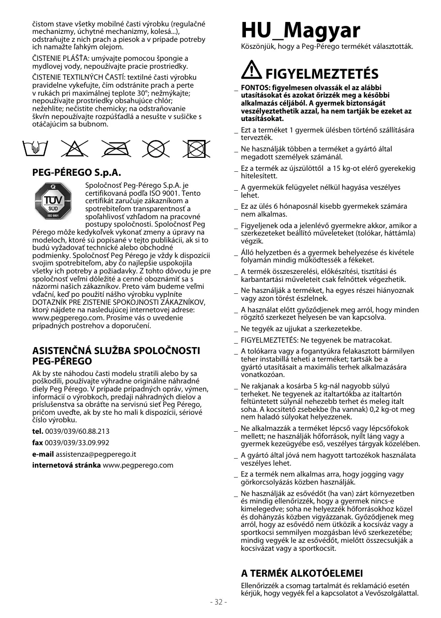 PEG-PÉREGO S.p.A. A Peg-Pérego Rt. ISO 9001 tanúsítánnyal rendelkezik. A tanúsítvány a vállalati munkamódszer rendszerezettségének és az abban való bizalomnak a garanciáját kínálja az ügyfeleknek és a fogyasztóknak. A Peg Pérego az ebben a kiadványban ismertetett modelleknél műszaki vagy kereskedelmi jellegű okokból kifolyólag bármikor végrehajthat módosításokat. A Peg Pérego a Fogyasztói rendelkezésére áll minden igényük legjobb kielégítése céljából. Ehhez az Ügyfeleink véleményének megismerése számunkra rendkívül fontos és értékes. Ezért nagyon hálásak lennénk, ha a termékünk használatbavétele után kitöltenék a FOGYASZTÓI ÉRTÉKELÉSI KÉRDŐÍVET és abban feltüntetnék az esetleges észrevételeiket vagy ötleteiket; a kérdőívet az alábbi internetes weboldalunkon találják meg: www.pegperego.com