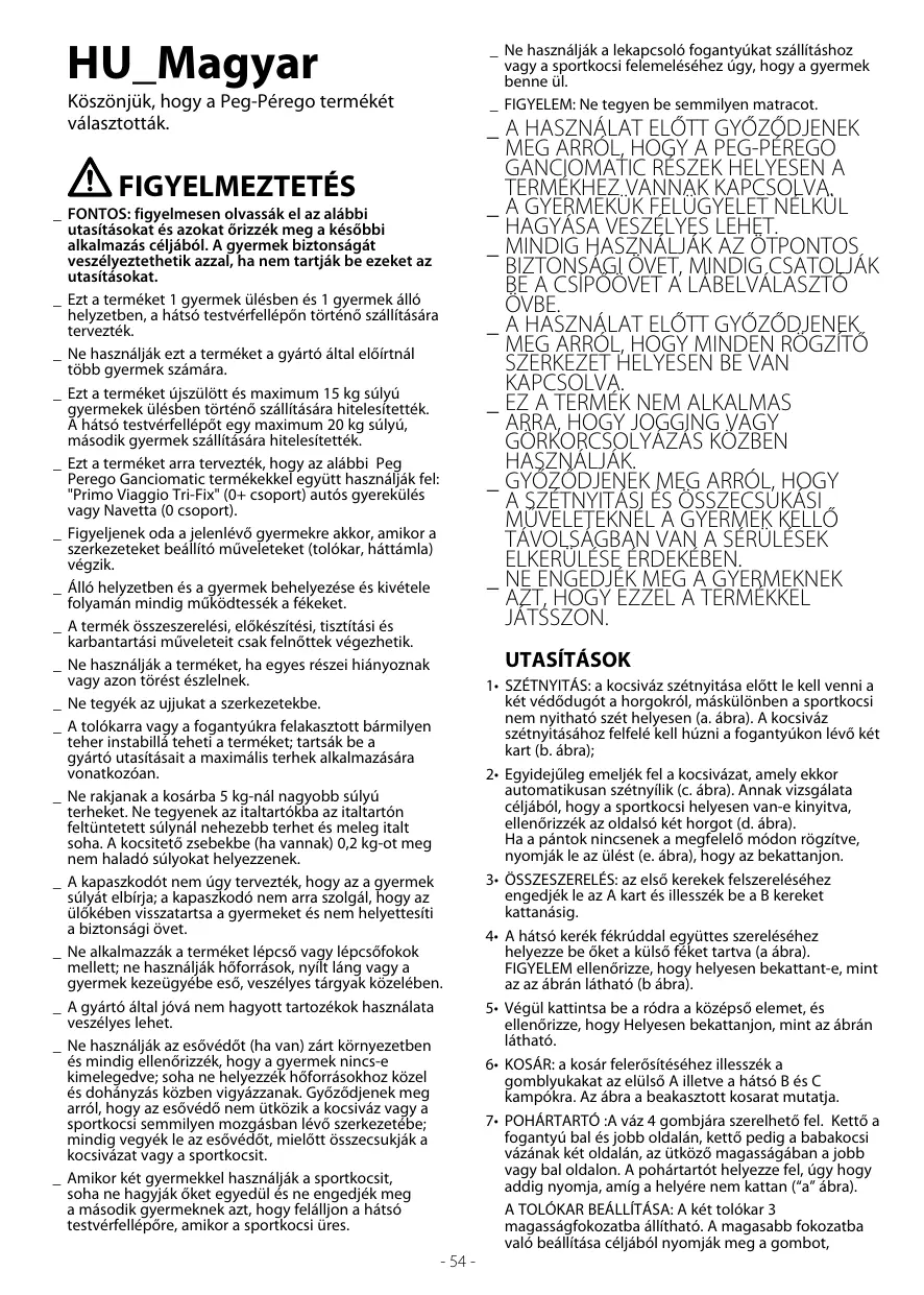 _ FONTOS: figyelmesen olvassák el az alábbi utasításokat és azokat őrizzék meg a későbbi alkalmazás céljából. A gyermek biztonságát veszélyeztethetik azzal, ha nem tartják be ezeket az utasításokat. _ Ezt a terméket 1 gyermek ülésben és 1 gyermek álló helyzetben, a hátsó testvérfellépőn történő szállítására tervezték. _ Ne használják ezt a terméket a gyártó által előírtnál több gyermek számára. _ Ezt a terméket újszülött és maximum 15 kg súlyú gyermekek ülésben történő szállítására hitelesítették. A hátsó testvérfellépőt egy maximum 20 kg súlyú, második gyermek szállítására hitelesítették. _ Ezt a terméket arra tervezték, hogy az alábbi Peg Perego Ganciomatic termékekkel együtt használják fel: "Primo Viaggio Tri-Fix" (0+ csoport) autós gyerekülés vagy Navetta (0 csoport). _ Figyeljenek oda a jelenlévő gyermekre akkor, amikor a szerkezeteket beállító műveleteket (tolókar, háttámla) végzik. _ Álló helyzetben és a gyermek behelyezése és kivétele folyamán mindig működtessék a fékeket. _ A termék összeszerelési, előkészítési, tisztítási és karbantartási műveleteit csak felnőttek végezhetik. _ Ne használják a terméket, ha egyes részei hiányoznak vagy azon törést észlelnek. _ Ne tegyék az ujjukat a szerkezetekbe. _ A tolókarra vagy a fogantyúkra felakasztott bármilyen teher instabillá teheti a terméket; tartsák be a gyártó utasításait a maximális terhek alkalmazására vonatkozóan. _ Ne rakjanak a kosárba 5 kg-nál nagyobb súlyú terheket. Ne tegyenek az italtartókba az italtartón feltüntetett súlynál nehezebb terhet és meleg italt soha. A kocsitető zsebekbe (ha vannak) 0,2 kg-ot meg nem haladó súlyokat helyezzenek. _ A kapaszkodót nem úgy tervezték, hogy az a gyermek súlyát elbírja; a kapaszkodó nem arra szolgál, hogy az ülőkében visszatartsa a gyermeket és nem helyettesíti a biztonsági övet. _ Ne alkalmazzák a terméket lépcső vagy lépcsőfokok mellett; ne használják hőforrások, nyílt láng vagy a gyermek kezeügyébe eső, veszélyes tárgyak közelében. _ A gyártó által jóvá nem hagyott tartozékok használata veszélyes lehet. _ Ne használják az esővédőt (ha van) zárt környezetben és mindig ellenőrizzék, hogy a gyermek nincs-e kimelegedve; soha ne helyezzék hőforrásokhoz közel és dohányzás közben vigyázzanak. Győződjenek meg arról, hogy az esővédő nem ütközik a kocsiváz vagy a sportkocsi semmilyen mozgásban lévő szerkezetébe; mindig vegyék le az esővédőt, mielőtt összecsukják a kocsivázat vagy a sportkocsit. _ Amikor két gyermekkel használják a sportkocsit, soha ne hagyják őket egyedül és ne engedjék meg a második gyermeknek azt, hogy felálljon a hátsó testvérfellépőre, amikor a sportkocsi üres.