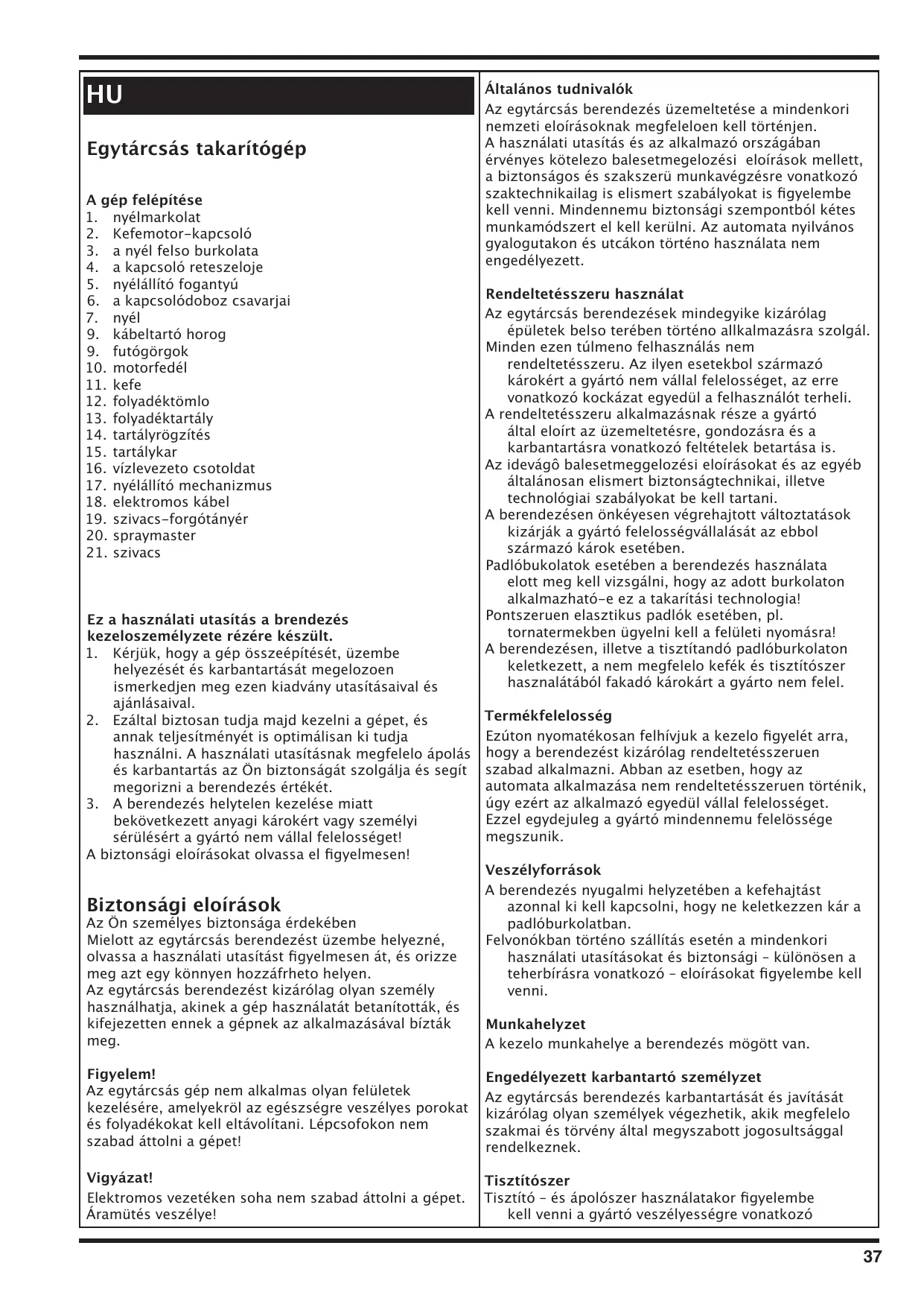 Si vous maintenez le timon en position centrale, la dʼentretien; le cas échéant, le port de lunettes et de machine travaille sur place. vêtements de protection sʼimpose. Nʼutiliser que des produits de nettoyage non Voici ce quʼil faut faire après lʼutilisation: combustibles, peu moussants et ne contenant pas de Relevez la poignée de réglage du manche (5) et amenez substances nocives pour la santé. le timon (7) en position verticale. Lʼattention est expressément attirée sur les risques liés Basculez ensuite la monobrosse sur ses roulettes à lʼutilisation de substances facilement inflammables, de roulement (9) et actionnez brièvement combustibles, toxiques, nocives pour la santé, le commutateur du moteur de la brosse (2). caustiques ou irritantes. Lʼaccessoire (11) se détache automatiquement. Retirez la fiche secteur de la prise de courant et Première mise en service enroulez le câble électrique (18) sur la poignée du La livraison, lʼinstruction sur les prescriptions de timon (1) et sur le crochet à câble (8). sécurité, lʼutilisation et la maintenance ainsi que la première mise en service sont assurées Nettoyage de base facile: généralement par notre spécialiste autorisé. La monobrosse est équipée des accessoires suivants Si ce nʼest pas le cas, lʼexploitant est lui-même pour le nettoyage de base: responsable de lʼinstruction de son personnel. Réservoir à liquide (13) Brosse à frotter (11) ou plateau à pad noir (19). Mise en service/fonctionnement Fixez le réservoir sur le dispositif dʼaccrochage (14).. Poussez le flexible dʼécoulement (12) sur la tubulure A respecter: Le voltage de lʼobjet à nettoyer doit correspondre à celui indiqué sur la plaquette dʼacheminement dʼeau (16). signalétique de la monobrosse. Remplissez le réservoir (13). Mettez ensuite en place la brosse ou le plateau avec le pad. Instructions de montage Réglez lʼalimentation en liquide avec le levier du La tête du moteur et le timon sont livrés emballés réservoir (15) en le relevant vers le haut. séparément. Lʼeau sale est aspirée section par section avec un Débloquez tout dʼabord les vis à six-pans creux sur le aspirateur dʼeau. groupe de réglage du manche (17). Introduisez ensuite légèrement le timon (7) jusquʼà la butée dans le groupe de réglage du manche (17). Shampooinage - fond et rationnel Ajustez la poignée du timon (1) parallèlement aux roulettes (9) de manière que la face ouverte du La machine est équipée des accessoires suivants pour le boîtier de la partie supérieure du manche (3) soit shampooinage: dirigée vers lʼarrière. - Réservoir à liquide; brosse de shampooinage Perlon Resserrez ensuite les vis à six-panx creux. 0,3 ou pad Sapur pour revêtements textiles. Enroulez le câble électrique (18) sur la poignée du Les opérations de travail sont similaires à celles du timon (a) et sur le crochet à câble (8). nettoyage de base. Mettez la machine en marche avec la brosse de Que faut-il faire avant lʻutilisation shampooinage à sec. Saisissez la poignée du timon (1) des deux mains et Dosez peu de liquide jusquʼà ce que les poils soient basculez la monobrosse jusquʼà ce quʼelle repose saturés de mousse. sur les deux roulettes (A). Passez la monobrosse à brosse rotative de gauche à Roulez ensuite la monobrosse jusquʼà son lieu droite ou vice-versa. La machine est aussitôt dʼutilisation et branchez le câble électrique à une ensuite guidée de la même manière dans le sens prise de courant. contraire avec un chevauchement correspondant à Déposez au sol lʼaccessoire (11), la brosse ou le plateau env. un quart de la largeur de travail (E). avec le pad. Guidez alors la machine en décrivant une spirale sur les Rebasculez la monobrosse sur ses roulettes et déplacezsurfaces de traivail préshampooinées. Les deux la sur la brosse (ou le plateau) jusquʼà ce que lʼétoile bandes de travail sont saisies sur toute la largeur (F). dʼentraînement et la bride de la brosse coincident. Lors du shampooinage, il est très recommandé dʼaspirer Placez la machine sur la brosse (B). immédiatement la mousse souillée section par Rabattez ensuite le levier de réglage du manche (5) et section avec un aspirateur dʼeau. amenez le timon (7) en position de travail. Vos deux bras sont alors légèrement étirés vers le bas (C). Ajustez la machine à lʼhorizontale sur lʼélément de Instruction de montage pour le travail (brosse ou plateau), actionnez le verrouillage réservoir de pulvérisation du commutateur (4) et actionnez légèrement le commutateur du moteur de la brosse (2). Montez le dispositif de retenue de la canette de Lʼaccessoire se met en place automatiquement. pulvérisation sur le timon (7) avec le support dirigé Voici comment utiliser la machine: Actionnez le commutateur du moteur de la brosse (2) (à droite ou à gauche). Le moteur démarre. Si vous soulevez légèrement le timon (7), la machine se déplace vers la droite (D). Si vous comprimez le timon vers le bas, la machine se