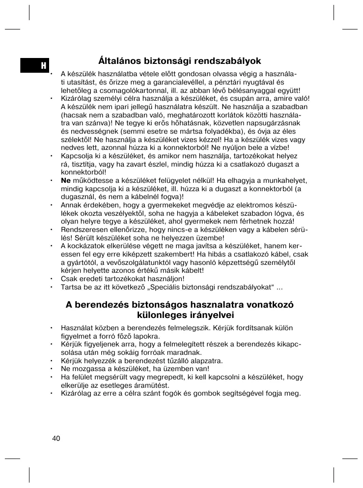 N’utilisez cet appareil que pour un usage privé et pour les taches auxquelles il est destiné. Cet appareil n’est pas prévu pour une utilisation professionnelle. Ne l’utilisez pas en plein air (sauf s’il est indiqué que vous pouvez le faire). Protégez-le de la chaleur, des rayons directs du soleil, de l’humidité (ne le plongez en aucun cas dans l’eau) et des objets tranchants. N’utilisez pas cet appareil avec des mains humides. S’il arrive que de l’humidité ou de l’eau atteignent l’appareil, débranchez aussitôt le câble d’alimentation. Ne touchez pas les parties mouillées. Arrêtez l’appareil et débranchez toujours le câble d’alimentation de la prise de courant (tirez sur la fiche, pas sur le câble) si vous n’utilisez pas l’appareil, si vous installez les accessoires, pour le nettoyage ou en cas de panne. Ne laissez jamais fonctionner l’appareil sans surveillance. Arrêtez toujours l’appareil ou débranchez le câble d’alimentation (en tirant sur la fiche et non pas sur le câble) si vous devez vous absenter. Pour protéger les enfants des risques engendrés par les appareils électriques , veillez à ce que le câble ne pende pas de l’appareil et que l’appareil ne soit pas à portée des enfants. Contrôlez régulièrement l’appareil et le câble. Ne mettez pas l’appareil en marche s’il est endommagé. Ne réparez pas l’appareil vous-même. Contactez plutôt un technicien qualifié. Pour éviter toute mise en danger, ne faites remplacer le câble défectueux que par un câble équivalent et que par le fabricant, notre service après-vente ou toute personne de qualification similaire. N’utilisez que les accessoires d’origine. Respectez les „conseils de sécurité spécifiques à cet appareil“ ci-dessous ...