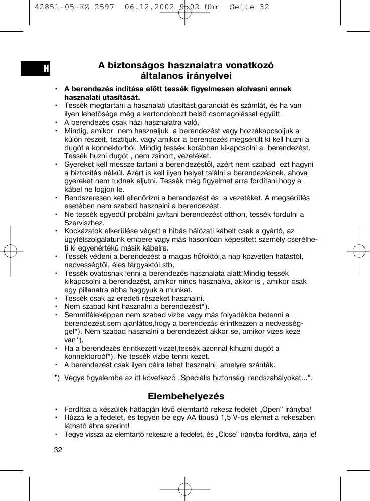 • A berendezés indítása előtt tessék figyelmesen elolvasni ennek hasznalati utasítását. • Tessék megtartani a hasznalati utasítást,garanciát és számlát, és ha van ilyen lehetősége még a kartondobozt belső csomagolással együtt. • A berendezés csak házi hasznalatra való. • Mindig, amikor nem hasznaljuk a berendezést vagy hozzákapcsoljuk a külön részeit, tisztítjuk. vagy amikor a berendezés megsérült ki kell huzni a dugót a konnektorból. Mindig tessék korábban kikapcsolni a berendezést. Tessék huzni dugót , nem zsinort, vezetéket. • Gyereket kell messze tartani a berendezéstől, azért nem szabad ezt hagyni a biztosítás nélkül. Azért is kell ilyen helyet találni a berendezésnek, ahova gyereket nem tudnak eljutni. Tessék még figyelmet arra fordítani,hogy a kábel ne logjon le. • Rendszeresen kell ellenőrízni a berendezést és a vezetéket. A megsérülés esetében nem szabad hasznalni a berendezést. • Ne tessék egyedül probálni javítani berendezést otthon, tessék fordulni a Szerviszhez. • Kockázatok elkerülése végett a hibás hálózati kábelt csak a gyártó, az ügyfélszolgálatunk embere vagy más hasonlóan képesített személy cserélheti ki egyenértékű másik kábelre. • Tessék védeni a berendezést a magas hőfoktól,a nap közvetlen hatástól, nedvességtől, éles tárgyaktól stb. • Tessék ovatosnak lenni a berendezés hasznalata alatt!Mindig tessék kikapcsolni a berendezést, amikor nincs hasznalva, akkor is , amikor csak egy pillanatra abba haggyuk a munkat. • Tessék csak az eredeti részeket hasznalni. • Nem szabad kint hasznalni a berendezést*). • Semmiféleképpen nem szabad vizbe vagy más folyadékba betenni a berendezést,sem ajanlátos,hogy a berendezás érintkezzen a nedvességgel*). Nem szabad hasznalni a berendezést akkor se, amikor vizes keze van*). • Ha a berendezés érintkezett vizzel,tessék azonnal kihuzni dugót a konnektorból*). Ne tessék vízbe tenni kezet. • A berendezést csak ilyen célra lehet hasznalni, amelyre szánták. *) Vegye figyelembe az itt következő „Speciális biztonsági rendszabályokat...“.