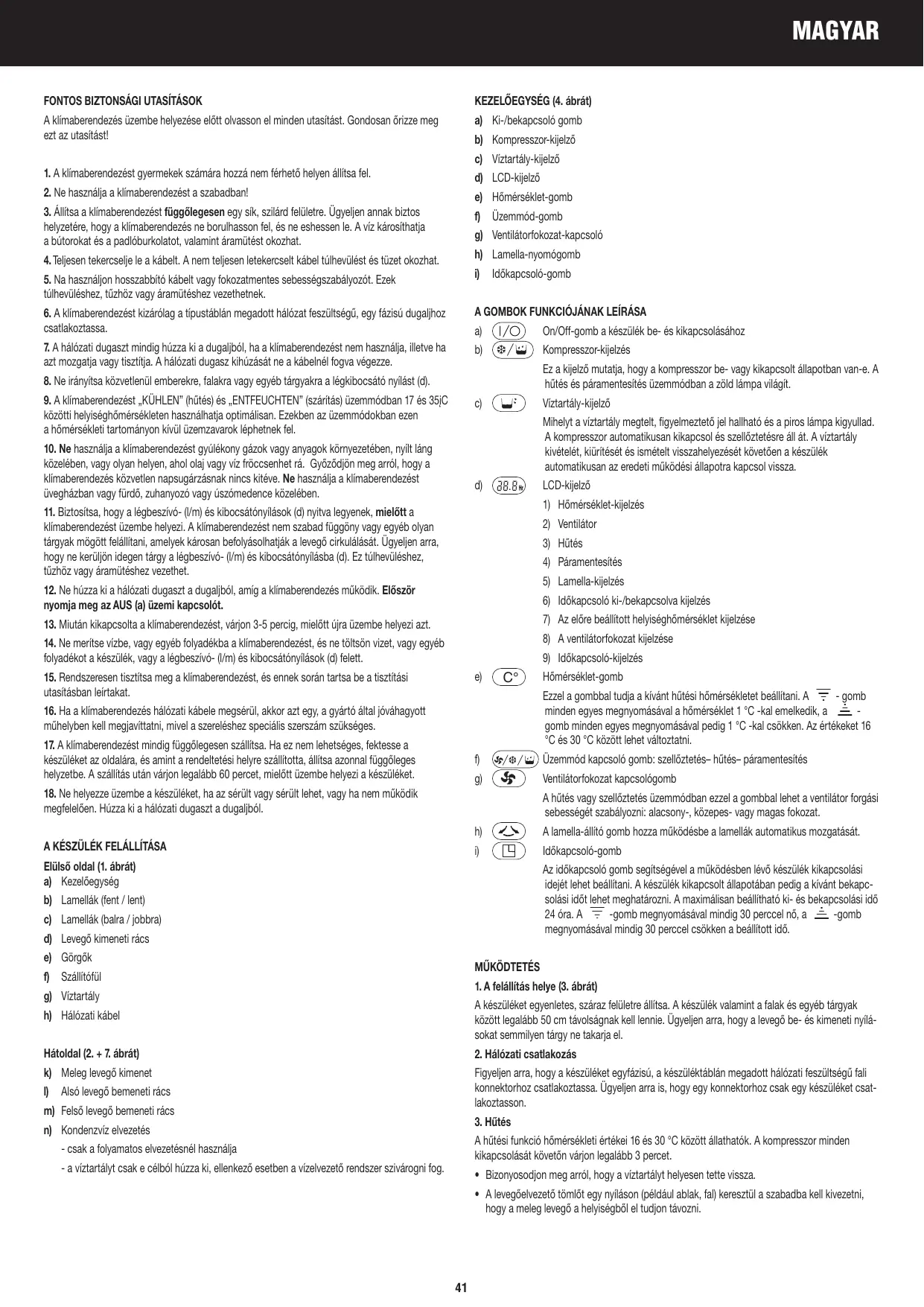 c) Lamelles (à gauche / à droite) d) Grille sortie d’air e) Rouleaux f) Poignée de transport g) Réservoir d’eau h) Câble du secteur