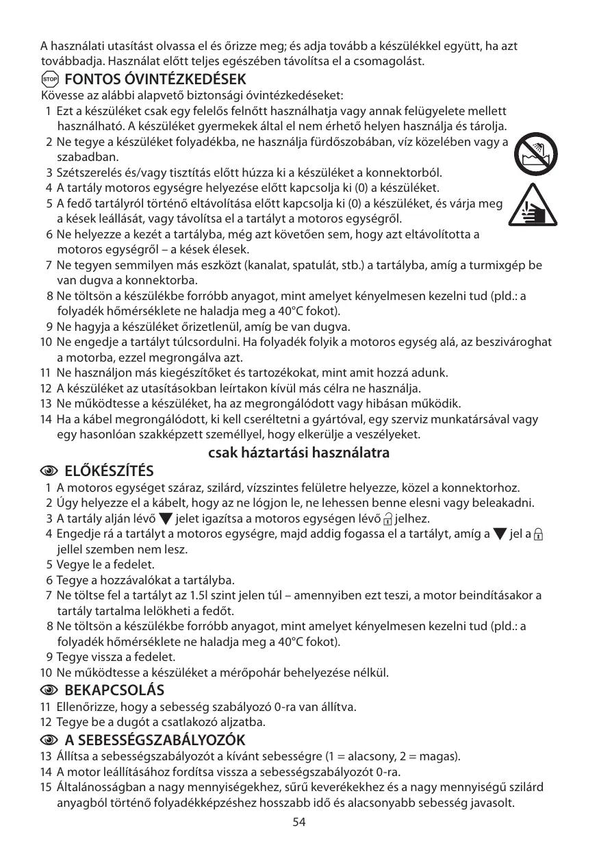 © ELOKÉSZITÉS 1 À motoros egységet széraz, szilärd, vizszintes felületre helyezze, kôzel a konnektorhoz. 2 Ugy helyezze el a käbelt, hogy az ne légjon le, ne lehessen benne elesni vagy beleakadni. 3 A tartäly aljän lévô W jelet igazitsa a motoros egységen lévé 4 jelhez. 4 Engedje ré a tartälyt a motoros egységre, majd addig fogassa el a tartälyt, amig a W jel a jellel szemben nem lesz. 5 Vegye le a fedelet. 6 Tegye a hozzävalékat a tartälyba. 7 Ne tôltse fel a tartälyt az 1.51 szint jelen tül - amennyiben ezt teszi, a motor beinditäsakor a tartly tartalma lelôkheti a fedôt. 8 Ne tôltsôn a készülékbe forrébb anyagot, mint amelyet kényelmesen kezelni tud (pld.: a folyadék hémérséklete ne haladja meg a 40°C fokot). 9 Tegye vissza a fedelet. 10 Ne mükôdtesse a készüléket a mérépohär behelyezése nélkül. @ BEKAPCSOLAS 11 Ellenérizze, hogy a sebesség szabälyozé O-ra van ällitva. 12 Tegye be a dugôt a csatlakozé aljzatba. © A SEBESSÉGSZABÂLYOZOK 13 Allitsa a sebességszabälyozét a kivänt sebességre (1 = alacsony, 2 = magas). 14 À motor leéllitéséhoz forditsa vissza a sebességszabälyozôt O-ra. 15 Altalänossägban a nagy mennyiségekhez, sûrü keverékekhez és a nagy mennyiségü szilärd anyagbél tôrténé folyadékképzéshez hosszabb idé és alacsonyabb sebesség javasolt. 54