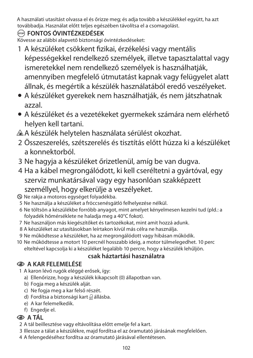 személlyel, hogy elkerülje a veszélyeket. © Ne rakja a motoros egységet folyadékba. 5 Ne hasznälja a készüléket a frccsenésgätlé felhelyezése nélkül. 6 Ne tôltsôn a készülékbe forrébb anyagot, mint amelyet kényelmesen kezelni tud (pld.: a folyadék hômérséklete ne haladja meg a 40°C fokot). 7 Ne hasznäljon ms kiegészitôket és tartozékokat, int amit hozzä adunk. 8 À készüléket az utasitsokban leirtakon kivül mäs célra ne hasznälja. 9 Ne mükôdtesse a készüléket, ha az megrongélédott vagy hibäsan mükôdik. 10 Ne mükôdtesse a motort 10 pernél hosszabb ideig, a motor tülmelegedhet. 10 perc elteltével kapcsolja ki a készüléket legaläbb 10 percre, hogy a készülék lehüljôn. csak häztartäsi hasznälatra © A KAR FELEMELÉSE 1 A karon lévé rugôk eléggé erôsek, igy: a) Ellenôrizze, hogy a készülék kikapcsolt (0) éllapotban van. b) Fogja meg a készülék aljät. ©) Ne fogja meg a kar fels6 részét. d) Forditsa a biztonsägi kart 9 ällésba. €) A kar felemelkedik. f) Engedie el. ® ATÂL 2 A tél beillesztése vagy eltävolitésa elôtt emelje fel a kart. 3 Illessze a télat a készülékre, majd forditsa el az éramutaté jrésänak megfeleléen. 4 Afelengedéséhez forditsa az éramutaté jéräsäval ellentétesen.