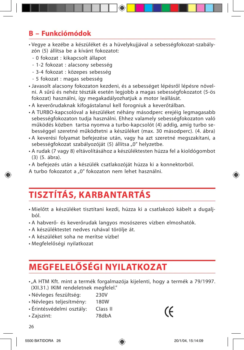 A TURBO-kapcsolóval a keszüléket néhányesianpocerejiglegmagasabb sebességfokozaton tudja használni. Ehhez valamelysebességfokozaton való muködés kozben tartsa nyomva a turbo-kapcsolót (4) addig, amigturbo sebességgel szeretné muködtetni a keszüléket (max. 30 masodperc). (4. ábra) - A keverési folyamat befejezése után, vagy ha azt szerétrne megszakitani, a sebességfokozat szabályozóját (5) állítsa „0" helyzetbe.