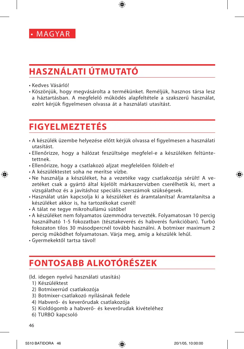 + Kedves Väsärlé! + Kôszônjük, hogy megväsérolta a termékünket. Reméljük, hasznos térsa lesz a héztartésban. À megfelelé mükôdés alapfeltétele a szakszerü hasznälat, ezért kérjük figyelmesen olvassa ét a hasznälati utasitäst. FIGYELMEZTETÉS + À készülék üzembe helyezése elôtt kérjük olvassa el figyelmesen a hasznälati utasitäst. + Ellenérizze, hogy a hälézat feszültsége megfelel-e a készüléken feltünte- tettnek. - Ellenérizze, hogy a csatlakozé aljzat megfeleléen fôldelt-e! + A készüléktestet soha ne meritse vizbe. + Ne hasznälja a készüléket, ha a vezetéke vagy csatlakozéja sérült! À ve- zetéket csak a gyärté ältal kijelôlt mérkaszervizben cserélhetik ki, mert a vizsgélathoz és a javitéshoz speciälis szerszämok szükségesek. + Hasznélat utén kapcsolja ki a készüléket és éramtalanitsa! Aramtalanitsa a készüléket akkor is, ha tartozékokat cserél! + A télat ne tegye mikrohullémü sütébet + À készüléket nem folyamatos üzemmédra tervezték. Folyamatosan 10 percig hasznälhaté 1-5 fokozatban (tésztakeverés és habverés funkciéban). Turbé fokozaton tilos 30 mäsodperenél toväbb hasznélni. À botmixer maximum 2 percig mükôdhet folyamatosan. Vérja meg, amig a készülék lehül. + Gyermekektôl tartsa tévol!