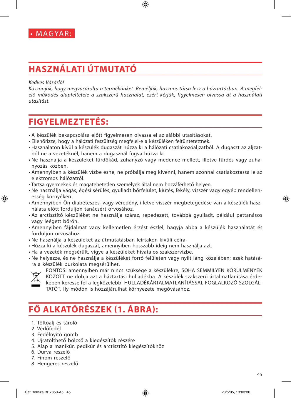 - Biztonsági okokból, az úratałthető bölcso (4)Csak akkor muködik, amikor a kiegészítok alapja (5), az arc-és bikinvonal szörzet eltávolíto (18) vagy a szempilla-gondörító (22) megfeleloen vannak felhelyezve.