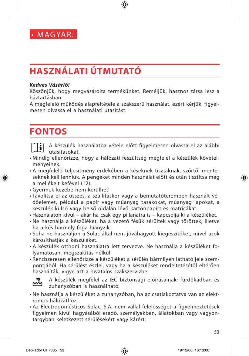 - Az Electrodomésticos Solac, S.A. nem vallal felelosséget a figyelmeztetések figyelmen kivül hagyásából eredő, személyekben, állatokban vagy vayontárgyban keletkezett séruléskért vagy kárét.