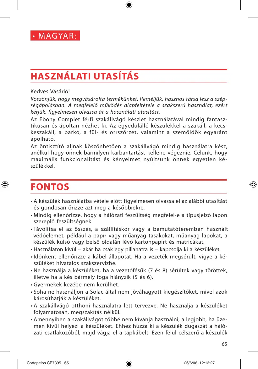 - Rendszeresen Ellenorizzee a szakallvagó t a sérulés barmilyen láthato jele szempontjábl. Ha sérulést eszle, vagy ha a készüléket rendeltetésétól eltero'anhasználták, vigye azt a hivatalos szakservizbe.
