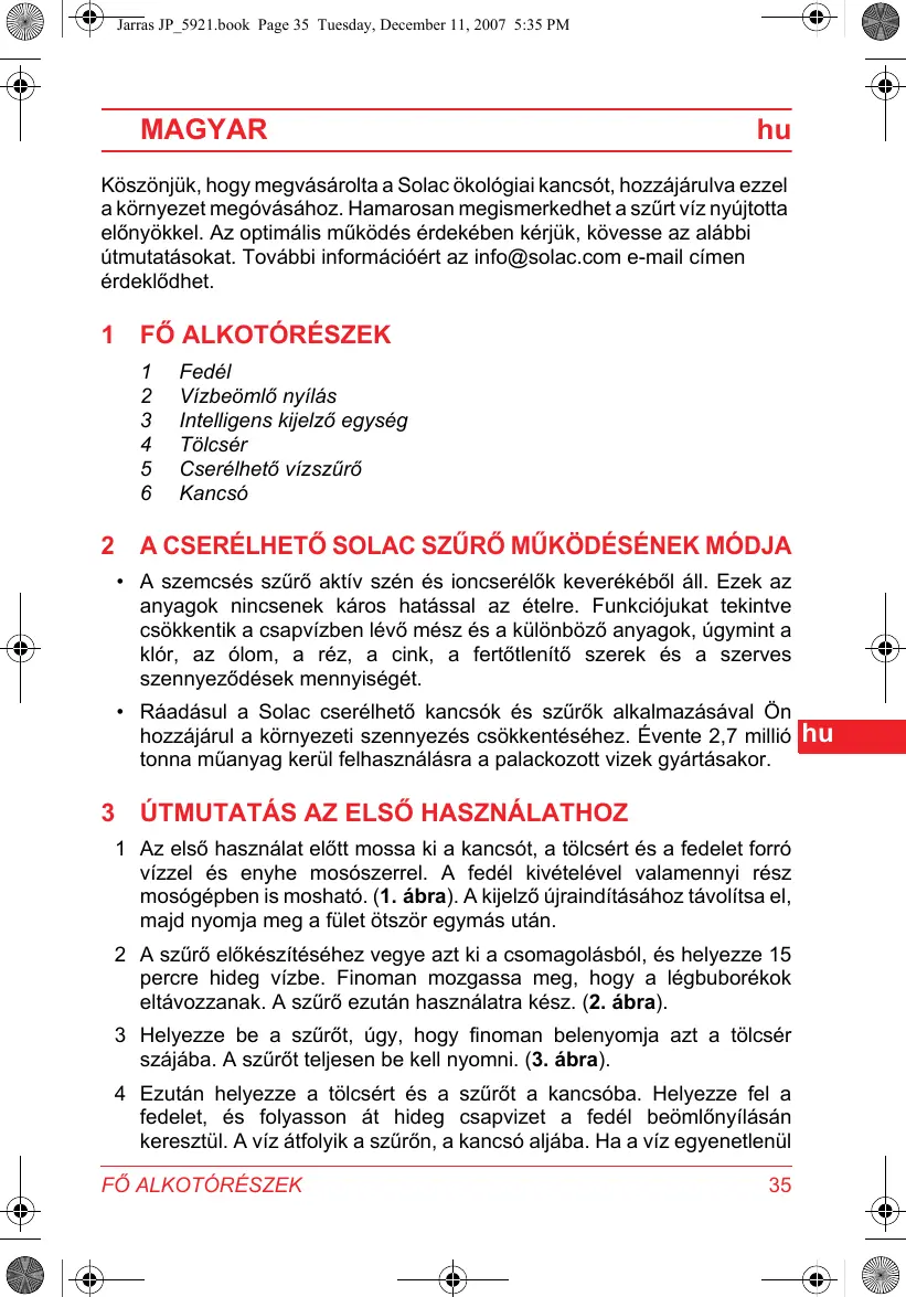 Köszönjuk, hogy megvásárolta a Solac ökologiai kancsót, hozzájárulva ezzel a környezet megóvásához. Hamarosan megismerkedhet a szúrt viz nyújtotta előnyökök. Az optimális működés érdekében kérjuk, kõvesse az alábbi utmutatasokat. További informáciorzt az info@solac.com e-mail címen érdekloédhet.