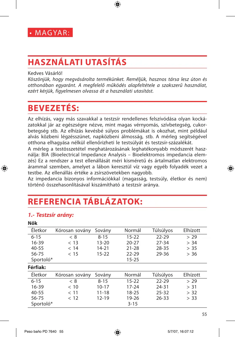 KO] MAGYA HASZNALATI UTASITAS Kedves Väsärlé! Kôszônjük, hogy megvésérolta termékänket. Reméljük, hasznos térsa lesz üton és otthondban egyaränt. À megfelelô mükôdés alapfeltétele a szakszerà hasznélat, ezért kérjük, figyelmesen olvassa ât a hasznélati utasitést. BEVEZETÉS: Az elhizés, vagy més szavakkal a testzsir rendellenes felszivédésa olyan kockä- zatokkal jér az egészségre nézve, mint magas vérnyomäs, szivbetegség, cukor- betegség stb. Az elhizäs kevésbé sülyos problémékat is okozhat, mint példäul alväs kôzbeni légzésszünet, napkôzbeni élmosség, stb. À mérleg segitségével otthona elhagyésa nélkül ellenrizheti le testsulyät és testzsir-szézalékét. À mérleg a testôsszetétel meghatärozäsänak leghatékonyabb médszerét hasz- nälja: BIA (Bioelectrical Impedance Analysis - Bioelektromos impedancia elem- z6s) Ez a rendszer a test ellenéllsét méri kisméretü és értalmatlan elektromos érammal szemben, amelyet a lébon keresztül viz vagy egyéb folyadék vezet a testbe. Az ellenällés értéke a zsirszôvetekben nagyobb. Az impedancia bizonyos informäciékkal (magassäg, testsüly, életkor és nem) tôrténé 6sszehasonlitéséval kiszämithaté a testzsir aränya. REFERENCIA TÂBLÂZATOK: 1.- Testzsir ardny: Nôk Életkor Kérosan soväny Sovany Normal Tülsülyos Elhizott 6-15 <8 8-15 15-22 22-29 > 29 16-39 < 13 13-20 20-27 27-34 > 34 40-55 <14 14-21 21-28 28-35 >35 56-75 <15 15-22 22-29 29-36 > 36 Sportolé* 15-25 Férfiak: Életkor Kérosan soväny Soväny Normél Tülsülyos Elhizott 6-15 <8 8-15 15-22 22-29 > 29 16-39 <10 10-17 17-24 24-31 >31 40-55 <11 11-18 18-25 25-32 > 32 56-75 < 12 12-19 19-26 26-33 >33 Sportolé* 3-15