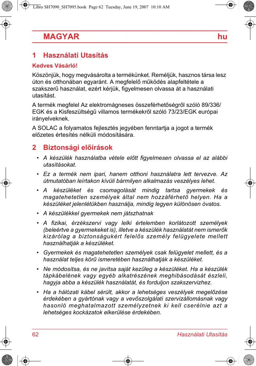 € To SH7090_SH7095.book Page 62 Tuesday, June 19, 2007 10:10 AM MAGYAR 1 Hasznälati Utasitäs Kedves Väsärlé! Kôszünjük, hogy megväsärolta a termékünket. Reméljük, hasznos târsa lesz üton és otthonäban egyaränt. À megfelelô mükôdés alapfeltétele a szakszerü hasznälat, ezért kérjük, figyelmesen olvassa ât a hasznälati utasitäst. A termék megfelel Az elektromägneses ôsszeférhetéségrôl szélé 89/336/ EGK és a Kisfeszültségü villamos termékekrôl szôlé 73/23/EGK eurépai irânyelveknek. A SOLAC a folyamatos fejlesztés jegyében fenntartja a jogot a termék elëzetes értesités nélküli médositäsära. 2 Biztonsägi eléiräsok + À készülék hasznälatba vétele elôtt figyelmesen olvassa el az aläbbi utasitäsokat. ütmutatéban leirtakon kivüli bérmilyen alkalmazäs veszélyes lehet. tehetetlen személyek ältal nem hozzäférh ket jelenlétükben hasznälja, mindig legyen kül sen vatos. A készülékkel gyermekek nem jâtszhatnak Ez a termék nem ipari, hanem otthoni hasznälatra lett tervezve. Az A készüléket és csomagoläsät mindig tartsa gyermekek és 6 helyen. Ha a A fizikai, érzékszervi vagy lelki értelemben korlâtozott személyek (beleértve a gyermekeket is), illetve a készülék hasznälatät nem ismerôk kizärolag a biztonsägukért felelôs személy felügyelete mellett hasznälhatjäk a készüléket. hasznälat teljes kôrü ismeretében hasznälhatjäk a készüléket. Gyermekek és magatehetetlen személyek csak felügyelet mellett, és a Ne mdositsa, és ne javitsa sajät kezüleg a készüléket. Ha a készülék tâäpkäbelének vagy egyéb alkatrészének meghibäsodäsät észleli, hagyja abba a készülék hasznälatät, és forduljon szakszervizhez. Ha a hälézati käbel sérült, akkor a lehetséges veszélyek megelôzése érdekében a gyärténak vagy a vevészolgälati szervizällomäsnak vagy hasonlé meghatalmazott személyzetnek ki kell cseréinie azt a lehetséges kockäzatok elkerülése érdekében.