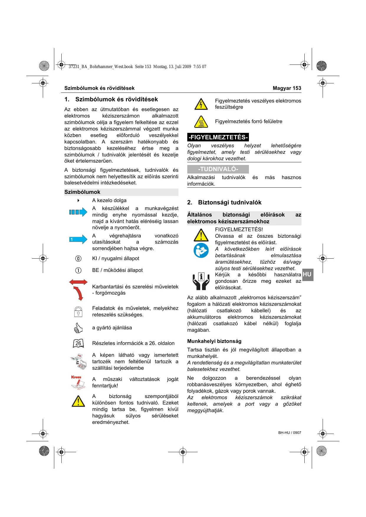 munkáljon meg kristályos kovasavat (SiO2) tartalmazó kőzetet. A megmunkálás közben egészségre veszélyes por keletkezik. Ne munkáljon meg azbeszttartalmú anyagot. Az azbeszt rákkeltő! Ha munkavégzés közben egészségre káros, éghető vagy robbanásveszélyes porok keletkezhetnek, tegyen védőintézkedéseket. Például: Egyes porok rákkeltőek. Viseljen porvédő maszkot amennyiben csatlakoztatható használjon por/ forgácselszívást. A gép csak a hozzá tartozó védőberendezéssel együtt működtethető. HU Mielőtt az elektromos kéziszerszámot letenné, várja meg, amíg az nyugalmi állapotba kerül. A betétszerszám megakadhat, ami az elektromos kéziszerszám feletti ellenőrzés elvesztését okozhatja. Munkavégzés közben mindig a berendezés mögött vezesse el a hálózati és hosszabbító kábelt. Ezzel kiküszöbölhető az, hogy munka közben esetleg megbotlik a kábelben. A csatlakozódugó csatlakozóaljzatból való kihúzása előtt állítsa a kapcsolót „KI” állásba. Ha a készüléket később ismét a hálózatra csatlakoztatják, akkor így elkerülhető a gép szándékolatlan elindulása csökken balesetveszély. A használaton kívüli szerszámokat biztonságosan, száraz és zárt helyiségekben, gyermekek által nem elérhető módon kell tárolni! BH-HU / 0907 Biztonsági tudnivalók rejtett ellátóvezetékek felderítéséhez használjon megfelelő keresőkészüléket, vagy kérje a helyi szolgáltató segítségét. Az elektromos vezetékekkel történő érintkezés tüzet és áramütést okozhat. A gázvezeték megsértése robbanást okozhat. A vízvezetékbe történő befúrás dologi kárhoz vezethet. betétszerszám elakadásakor azonnal kapcsolja ki az elektromos kéziszerszámot. Legyen készenlétben a visszaütést okozó nagy ellennyomatékok megtartására. A betétszerszám a következő okok miatt akad el: az elektromos kéziszerszám túlterhelõdik vagy