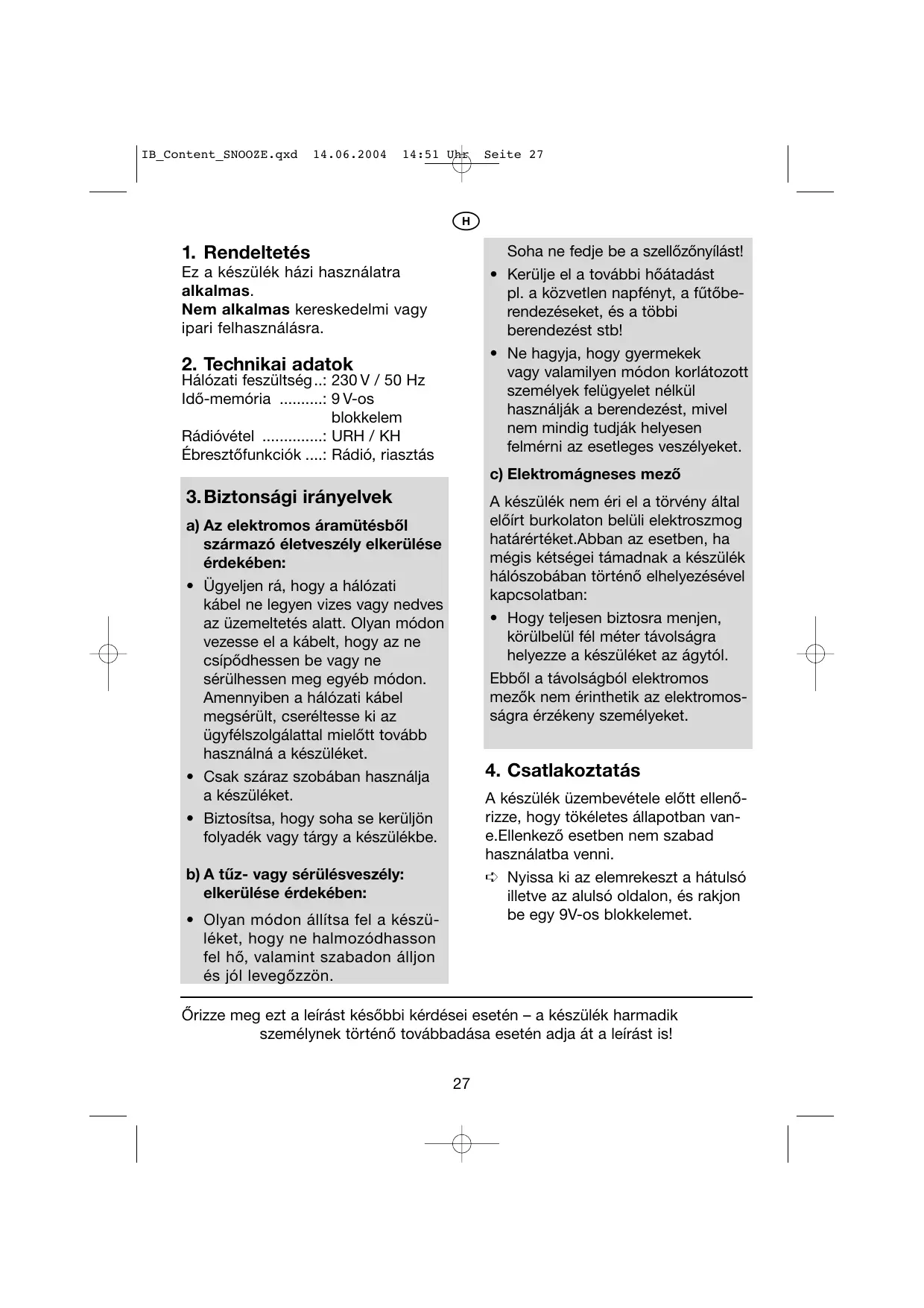 HASZNÁLATI ÚTMUTATÓ KH 2275 RADIO ALARM EBENCH