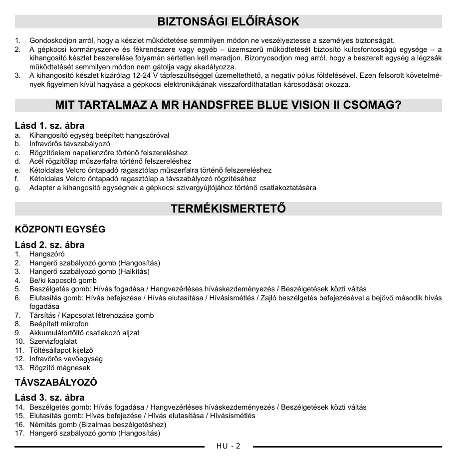 Gondoskodjon arról, hogy a készlet működtetése semmilyen módon ne veszélyeztesse a személyes biztonságát. A gépkocsi kormányszerve és fékrendszere vagy egyéb – üzemszerű működtetését biztosító kulcsfontosságú egysége – a kihangosító készlet beszerelése folyamán sértetlen kell maradjon. Bizonyosodjon meg arról, hogy a beszerelt egység a légzsák működtetését semmilyen módon nem gátolja vagy akadályozza. A kihangosító készlet kizárólag 12-24 V tápfeszültséggel üzemeltethető, a negatív pólus földelésével. Ezen felsorolt követelmények figyelmen kívül hagyása a gépkocsi elektronikájának visszafordíthatatlan károsodását okozza. MIT TARTALMAZ A MR HANDSFREE BLUE VISION II CSOMAG? Lásd 1. sz. ábra
