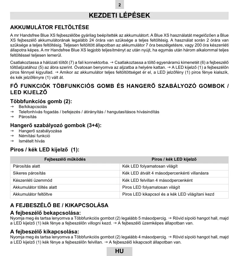 A Blue XS fejbeszelö a párositäté ápárosítási eljárast megelözöen ki legyen kapcsolver. → Nyomja meg és tartsa lenyomva a Többfunkciós gombot (2) addig, amig a LED kijelzó (1) ké fénye a fejbeszelón folyamatosan vilagitani kezd. → A Blue XS fejbeszelő kesz a párosítára. → Bluetooth® mobiletelefonja hasznalatl utasítását követte inditson le Bluetooth® esköz keresésst a Blue XS fejbeszelö párosítáhsoz. → A mobiletelefonja altal megtalalt eszkök ököl valaszka i a Blue XS fejbeszelőt. → A párosítás lebonyolításához üsse be gyári 0000 azonosito PIN-kódot és erösítse meg a bevitelt. → Sikeres párosítás és csatlakoztatás utan a LED kijelzó (1) ké fénye négy másodpercenkest felvillan.