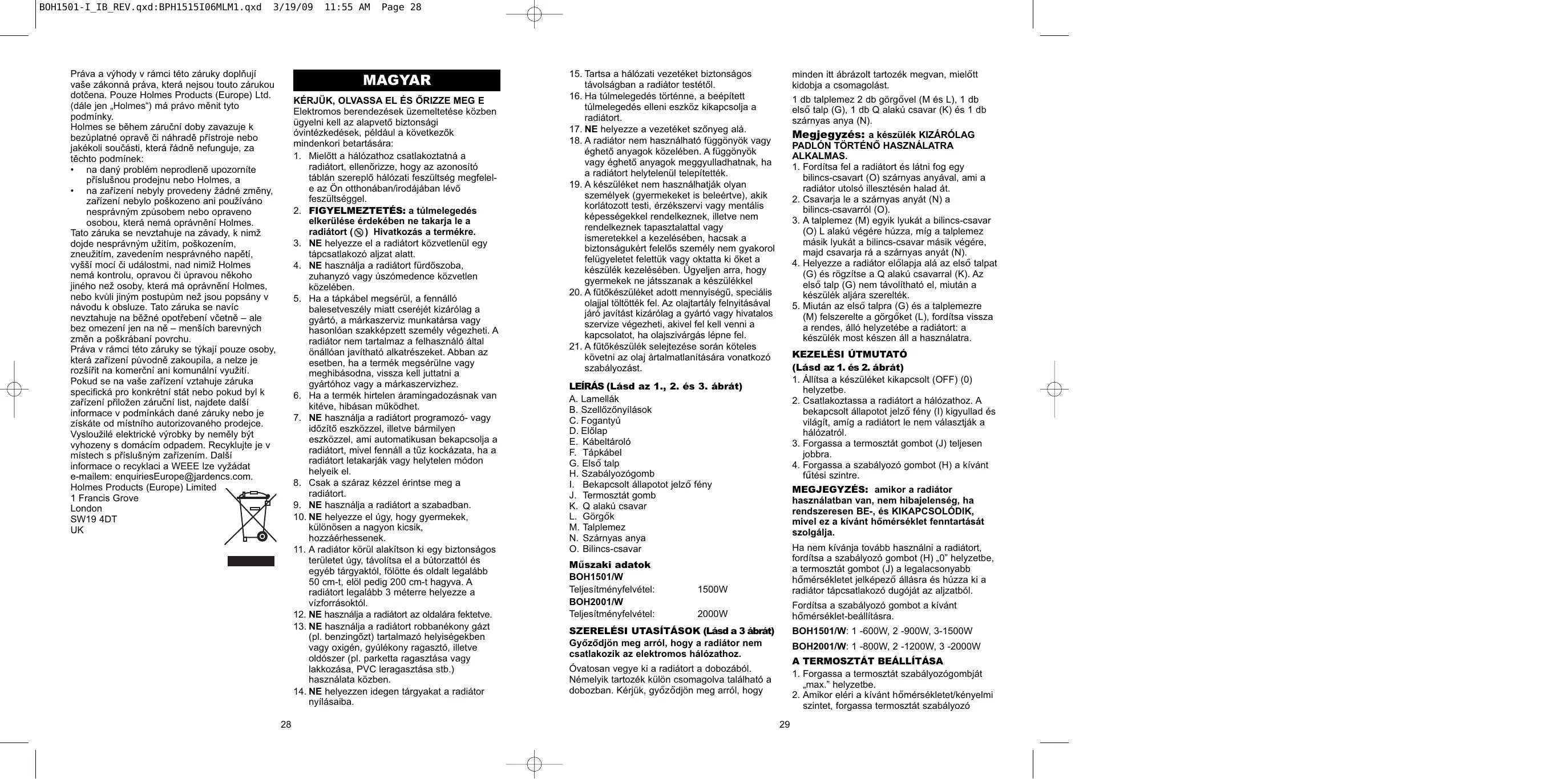 BOH2001/W Teljesitményfelvétel: 2000W SZERELÉSI UTASITÂSOK (Läsd a 3 âbrät) Gy6z6djôn meg arrôl, hogy a radiätor nem csatlakozik az elektromos hälézathoz. Ovatosan vegye ki Némelyik tartozék dobozban. Kérjük, gy