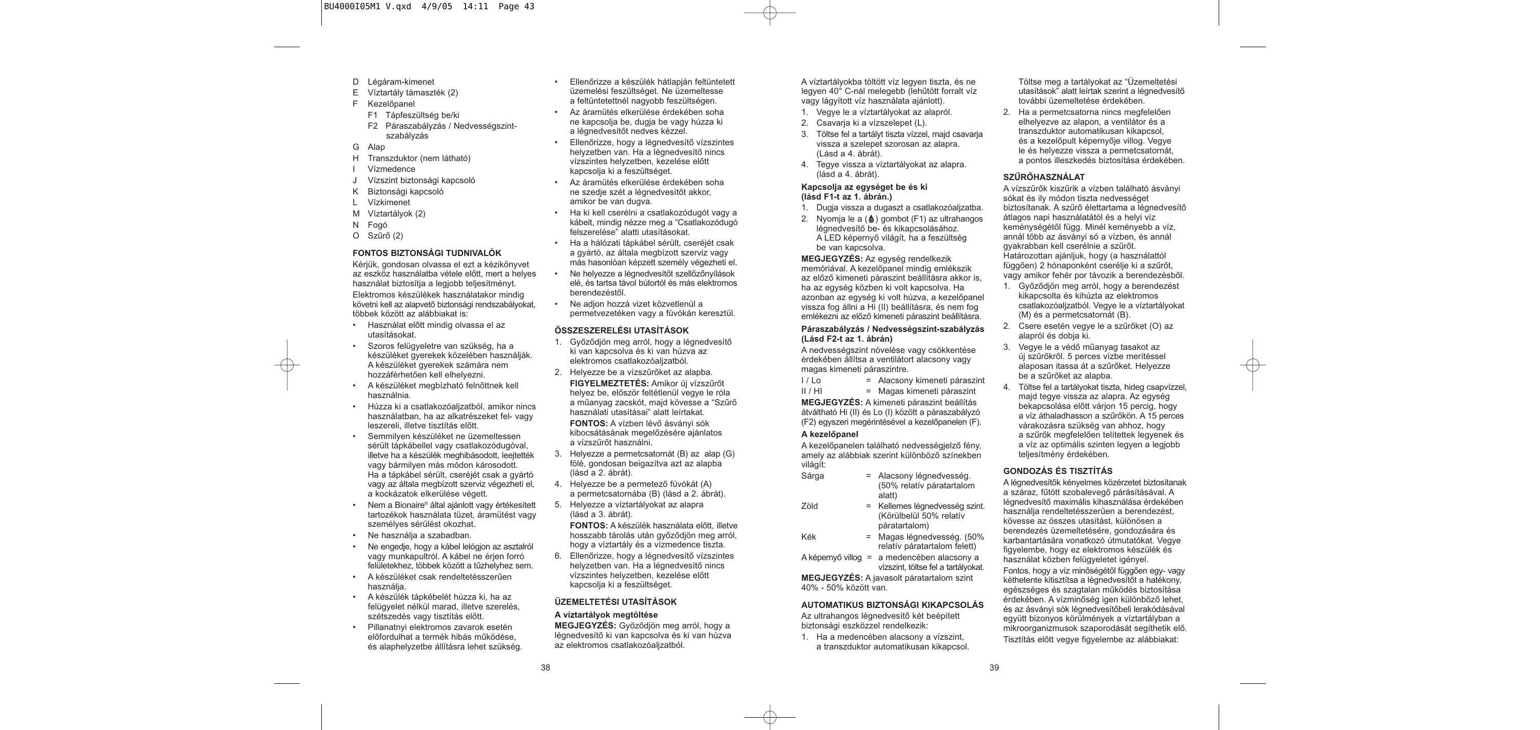 Töltse meg a tartályokat az “Üzemeltetési utasítások” alatt leírtak szerint a légnedvesítő további üzemeltetése érdekében. 2. Ha a permetcsatorna nincs megfelelően elhelyezve az alapon, a ventilátor és a transzduktor automatikusan kikapcsol, és a kezelőpult képernyője villog. Vegye le és helyezze vissza a permetcsatornát, a pontos illeszkedés biztosítása érdekében. SZŰRŐHASZNÁLAT A vízszűrők kiszűrik a vízben található ásványi sókat és ily módon tiszta nedvességet biztosítanak. A szűrő élettartama a légnedvesítő átlagos napi használatától és a helyi víz keménységétől függ. Minél keményebb a víz, annál több az ásványi só a vízben, és annál gyakrabban kell cserélnie a szűrőt. Határozottan ajánljuk, hogy (a használattól függően) 2 hónaponként cserélje ki a szűrőt, vagy amikor fehér por távozik a berendezésből. 1. Győződjön meg arról, hogy a berendezést kikapcsolta és kihúzta az elektromos csatlakozóaljzatból. Vegye le a víztartályokat (M) és a permetcsatornát (B). 2. Csere esetén vegye le a szűrőket (O) az alapról és dobja ki. 3. Vegye le a védő műanyag tasakot az új szűrőkről. 5 perces vízbe merítéssel alaposan itassa át a szűrőket. Helyezze be a szűrőket az alapba. 4. Töltse fel a tartályokat tiszta, hideg csapvízzel, majd tegye vissza az alapra. Az egység bekapcsolása előtt várjon 15 percig, hogy a víz áthaladhasson a szűrőkön. A 15 perces várakozásra szükség van ahhoz, hogy a szűrők megfelelően telítettek legyenek és a víz az optimális szinten legyen a legjobb teljesítmény érdekében. GONDOZÁS ÉS TISZTÍTÁS A légnedvesítők kényelmes közérzetet biztosítanak a száraz, fűtött szobalevegő párásításával. A légnedvesítő maximális kihasználása érdekében használja rendeltetésszerűen a berendezést, kövesse az összes utasítást, különösen a berendezés üzemeltetésére, gondozására és karbantartására vonatkozó útmutatókat. Vegye figyelembe, hogy ez elektromos készülék és használat közben felügyeletet igényel. Fontos, hogy a víz minőségétől függően egy- vagy kéthetente kitisztítsa a légnedvesítőt a hatékony, egészséges és szagtalan működés biztosítása érdekében. A vízminőség igen különböző lehet, és az ásványi sók légnedvesítőbeli lerakódásával együtt bizonyos körülmények a víztartályban a mikroorganizmusok szaporodását segíthetik elő. Tisztítás előtt vegye figyelembe az alábbiakat: 39