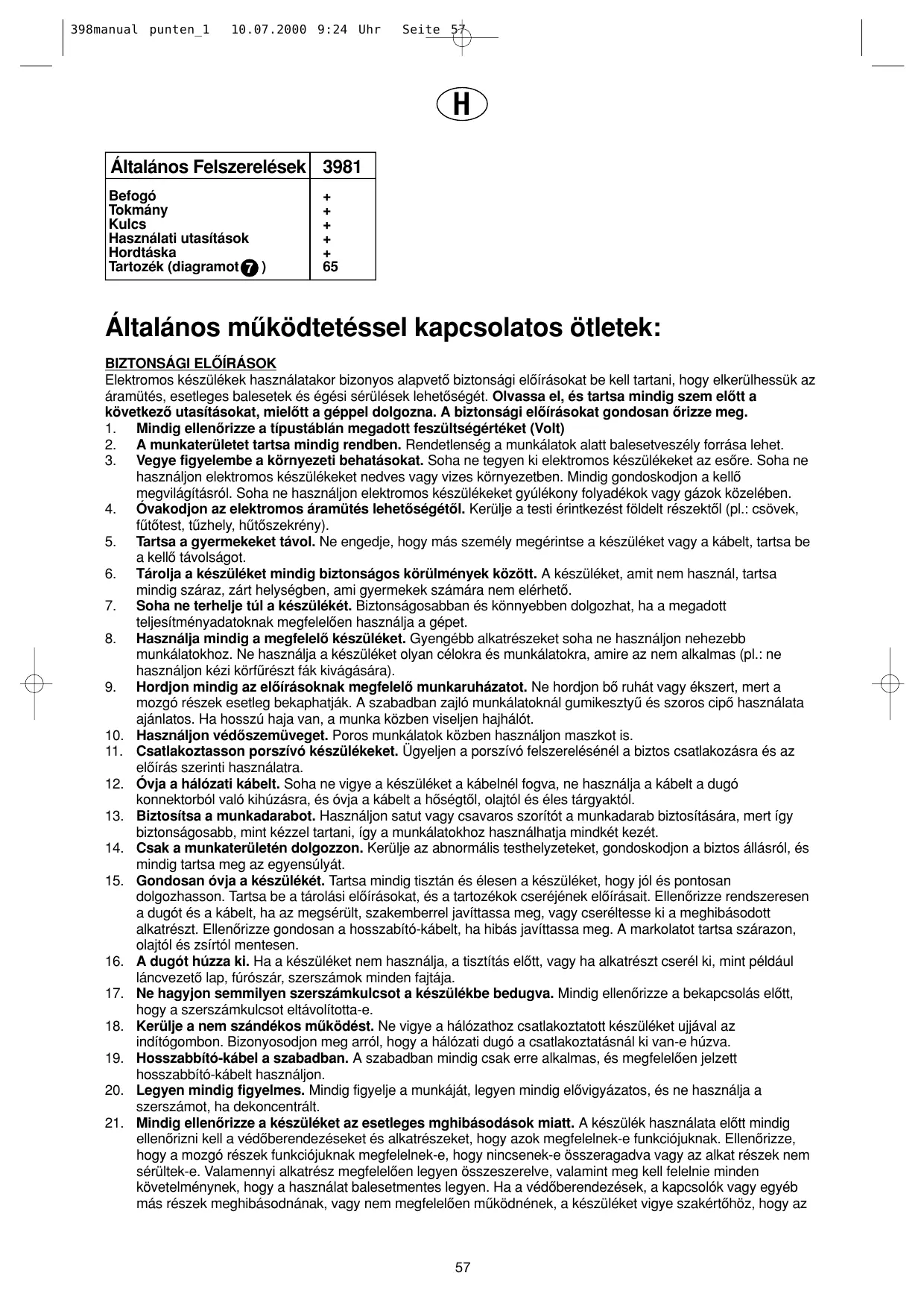 ?J@@@@@@@@@@@@@@@@@@@H ?? Tenez compte de l'environnement du poste de travail. N'exposez pas les outils électriques à la pluie. N'utilisez pas d'outils électriques dans un environnement humide ou mouillé. Veillez à ce que le poste de travail soit bien éclairé. N'utilisez pas d'outils électriques si des liquides ou des gaz inflammables se trouvent à proximité. Protégez-vous contre les décharges électriques. Evitez le contact corporel avec des surfaces reliées à la terre (comme p. ex. tuyaux, radiateurs, cuisinières, réfrigérateurs). Tenez les enfants éloignés. Ne permettez pas que d'autres personnes touchent à l'outil ou au câble ; tenez-les éloignées de votre poste de travail. Rangez vos outils dans un endroit sûr. Les outils non utilisés devraient être rangés dans un endroit sec et fermé, hors de la portée des enfants. Ne surchargez pas votre outil. Vous travaillerez mieux et plus sûrement dans la plage de puissance indiquée. Utilisez l'outil adéquat. N'utilisez pas d'outils ou de dispositifs adaptables de trop faible puissance pour exécuter des travaux difficiles. N'utilisez pas des outils à des fins et pour des travaux pour lesquels ils n'ont pas été conçus (p. ex. n'employez pas une scie circulaire pour abattre ou pour ébrancher des arbres). Portez des vêtements de travail appropriés. Ne portez pas de vêtements larges ou des bijoux ; ils pourraient être happés par les pièces en mouvement. Lors de travaux à l'extérieur, il est recommandé de porter des gants de caoutchouc et des chaussures à semelle antidérapante. Coiffez-vous d'un filet si vous avez les cheveux longs. Portez des lunettes de protection. Utilisez aussi un masque si le travail exécuté produit de la poussière. Installez le système d'évacuation des poussières. Si l'outil est équipé des dispositifs d'évacuation et de ramassage des poussières, assurez-vous qu'ils soient bien raccordés et utilisés correctement. Protégez le câble d'alimentation. Ne portez pas l'outil par le câble, ne tirez pas sur le câble pour débrancher la fiche de la prise, et protégez le câble de la chaleur, de l'huile et des arêtes vives. Fixez bien la pièce. Employez un dispositif de serrage ou un étau afin de bien fixer la pièce ; elle sera ainsi bloquée plus sûrement qu'avec votre main et vous aurez les deux mains libres pour manier l'outil. N'élargissez pas trop votre rayon d'action. Evitez d'adopter une position fatigante pour le corps ; veillez à ce que votre appui au sol soit ferme et conservez l'équilibre à tout moment. Entretenez vos outils soigneusement. Maintenez vos outils affûtés et propres afin de travailler mieux et plus sûrement. Observez les prescriptions d'entretien et les indications de changement d'accessoires. Vérifiez régulièrement l'état de la fiche et du câble d'alimentation et, en cas de dommages, faites-les changer par un technicien qualifié. Vérifiez régulièrement le câble de rallonge et remplacez-le s'il est endommagé. Maintenez les poignées sèches et exemptes d'huile et de graisse. Débranchez la fiche de la prise. En cas de non-utilisation, avant de procéder à l'entretien, ou lors du changement d'accessoires comme p. ex. des lames et des forets. Enlevez les clés à outils. Avant de mettre l'outil en marche, assurez-vous que les clés et les outils de réglage ont été retirés. Evitez tout démarrage involontaire. Ne portez pas l'outil en ayant un doigt placé sur l'interrupteur tant qu'il est branché au réseau électrique. Assurez-vous que l'interrupteur est en position de coupure avant de brancher l'outil au réseau électrique. Câble de rallonge pour l'extérieur. A l'extérieur, n'utilisez que des câbles de rallonge homologués avec le marquage correspondant. Soyez toujours attentif. Observez votre travail, agissez en faisant preuve de bon sens et n'employez pas l'outil lorsque vous êtes fatigué. Contrôlez si votre outil est endommagé. Avant d'utiliser l'outil, vérifiez toujours soigneusement le parfait fonctionnement des dispositifs de sécurité et des pièces. Vérifiez si le fonctionnement des pièces en mouvement est correct, si elles ne se grippent pas ou si d'autres pièces sont endommagées. Tous les composants doivent être montés correcte27