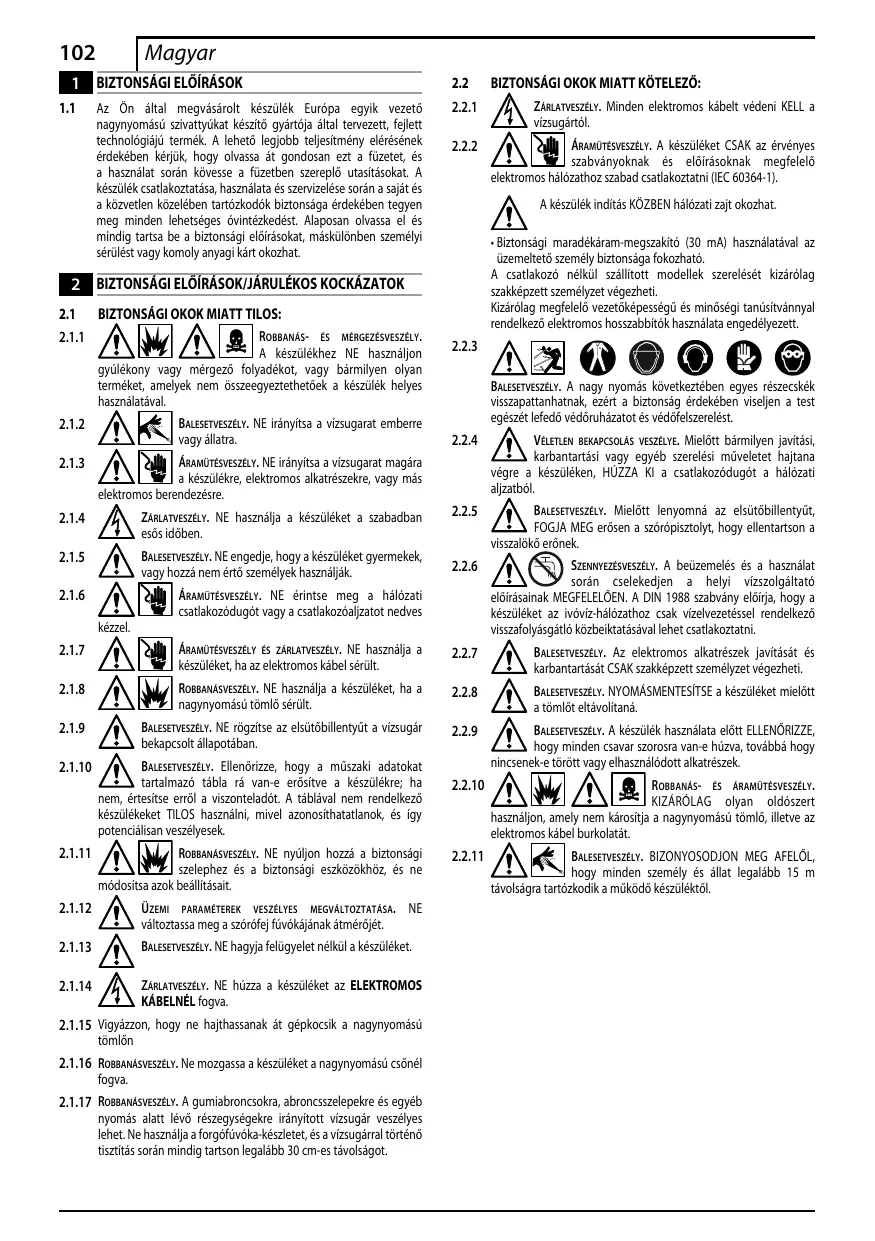 2.2.3 Balesetveszély. A nagy nyomás következtében egyes részecskék visszapattanhatnak, ezért a biztonság érdekében viseljen a test egészét lefedő védőruházatot és védőfelszerelést.