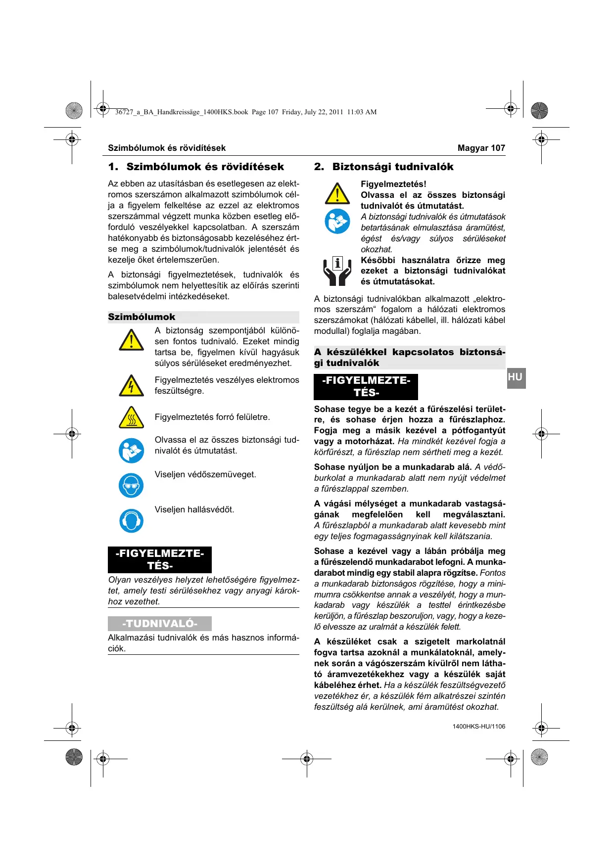 A biztonsägi tudnivalékban alkalmazott ,elektro- mos szerszém“ fogalom a hälézati elektromos szerszmokat (hélézati kébellel, ill. hélézati kébel modullal) foglalja magäban. Figyelmeztetés! Olvassa el az ôsszes biztonsägi tudnivalét és ütmutatäst. A biztonségi tudnivalék és ütmutatésok betartésänak elmulasztésa éramütést, égést ésvagy sülyos sérüléseket okozhat. Késébbi hasznélatra érizze meg ezeket a biztonsägi tudnivalékat és ütmutatäsokat. A készülékkel kapcsolatos biztonsä- gi tudnivalék IGYELMEZTE. LL: Sohase tegye be a kezét a fürészelési terület- re, és sohase érjen hozza a fürészlaphoz. Fogja meg a mäsik kezével a pétfogantyüt vagy a motorhäzat. Ha mindkét kezével fogja a kôrürészt, a fürészlap nem sértheti meg a kezét. Sohase nyüljon be a munkadarab alä. À védé- burkolat a munkadarab alatt nem nyüjt védelmet a fürészlappal szemben. À vägési mélységet a munkadarab vastagsä- gänak megfeleléen kell megvälasztani. À fürészlapbél a munkadarab alatt kevesebb mint egy teljes fogmagassägnyinak kell kilätszania. Sohase a kezével vagy a lébän prébélja meg a fürészelendé munkadarabot lefogni. À munka- darabot mindig egy stabil alapra rôgzitse. Fontos a munkadarab biztonségos rôgzitése, hogy a mini- mumra csôkkentse annak a veszélyét, hogy à mun- kadarab vagy készülék a testtel érintkezésbe Kerüiljën, a fürészlap beszoruljon, vagy, hogy a keze- 16 eWessze az uralmét à készülék felett. A készüléket csak a szigetelt markolatnäl fogva tartsa azoknäl a munkélatoknäl, amely- nek sorän a vâgészerszäm kivülrôl nem létha- té äramvezetékekhez vagy a készülék sajät käbeléhez érhet. Ha a készülék feszültségvezetô vezetékhez ér, a készülék fém alkatrészei szintén feszültség alé kerülnek, ami éramütést okozhat. 1400HKS-HU/1108