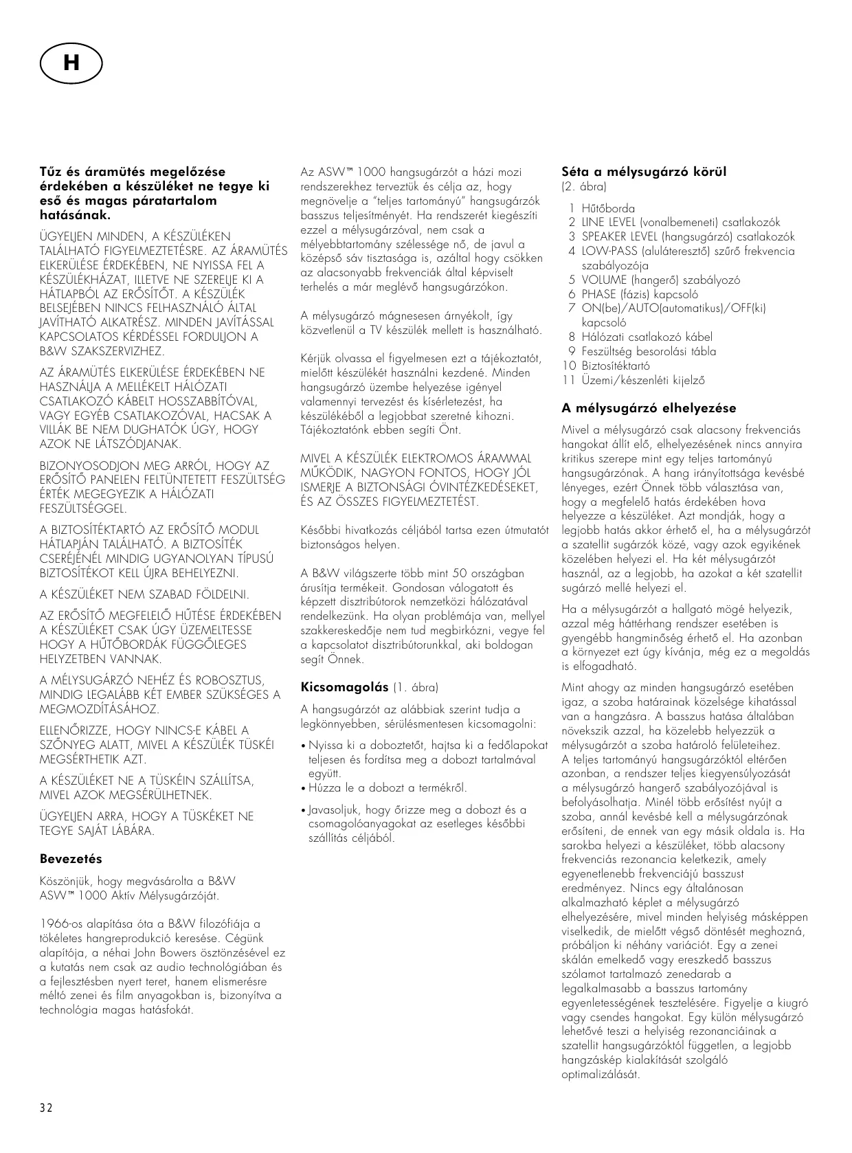 Az ASW™1000 hangsugárzót a házi mozi rendszerekhez terveztük és célja az, hogy megnövelje a “teljes tartományú” hangsugárzók basszus teljesítményét. Ha rendszerét kiegészíti ezzel a mélysugárzóval, nem csak a mélyebbtartomány szélessége nµ, de javul a középsµ sáv tisztasága is, azáltal hogy csökken az alacsonyabb frekvenciák által képviselt terhelés a már meglévµ hangsugárzókon. A mélysugárzó mágnesesen árnyékolt, így közvetlenül a TV készülék mellett is használható. Kérjük olvassa el figyelmesen ezt a tájékoztatót, mielµtt készülékét használni kezdené. Minden hangsugárzó üzembe helyezése igényel valamennyi tervezést és kísérletezést, ha készülékébµl a legjobbat szeretné kihozni. Tájékoztatónk ebben segíti Önt. MIVEL A KÉSZÜLÉK ELEKTROMOS ÁRAMMAL M∂KÖDIK, NAGYON FONTOS, HOGY JÓL ISMERJE A BIZTONSÁGI ÓVINTÉZKEDÉSEKET, ÉS AZ ÖSSZES FIGYELMEZTETÉST. Késµbbi hivatkozás céljából tartsa ezen útmutatót biztonságos helyen. A B&W világszerte több mint 50 országban árusítja termékeit. Gondosan válogatott és képzett disztribútorok nemzetközi hálózatával rendelkezünk. Ha olyan problémája van, mellyel szakkereskedµje nem tud megbirkózni, vegye fel a kapcsolatot disztribútorunkkal, aki boldogan segít Önnek.