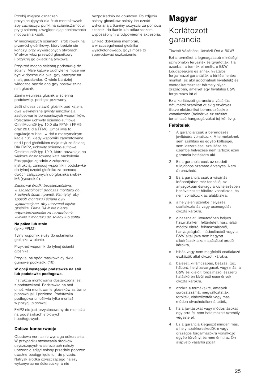 Magyar Korlátozott garancia Tisztelt Vásárlónk, üdvözli Önt a B&W! Ezt a terméket a legmagasabb minµségi színvonalon tervezték és gyártották. Ha azonban a termék elromlik, a B&W Loudspeakers és annak hivatalos forgalmazói garantálják a térítésmentes munkát (ez alól adódhatnak kivételek) és cserealkatrészeket bármely olyan országban, amelyet egy hivatalos B&W forgalmazó lát el. Ez a korlátozott garancia a vásárlás dátumától számított öt évig érvényes illetve elektronikai berendezésekre vonatkozóan (beleértve az erµsítµt tartalmazó hangsugárzókat is) két évig.