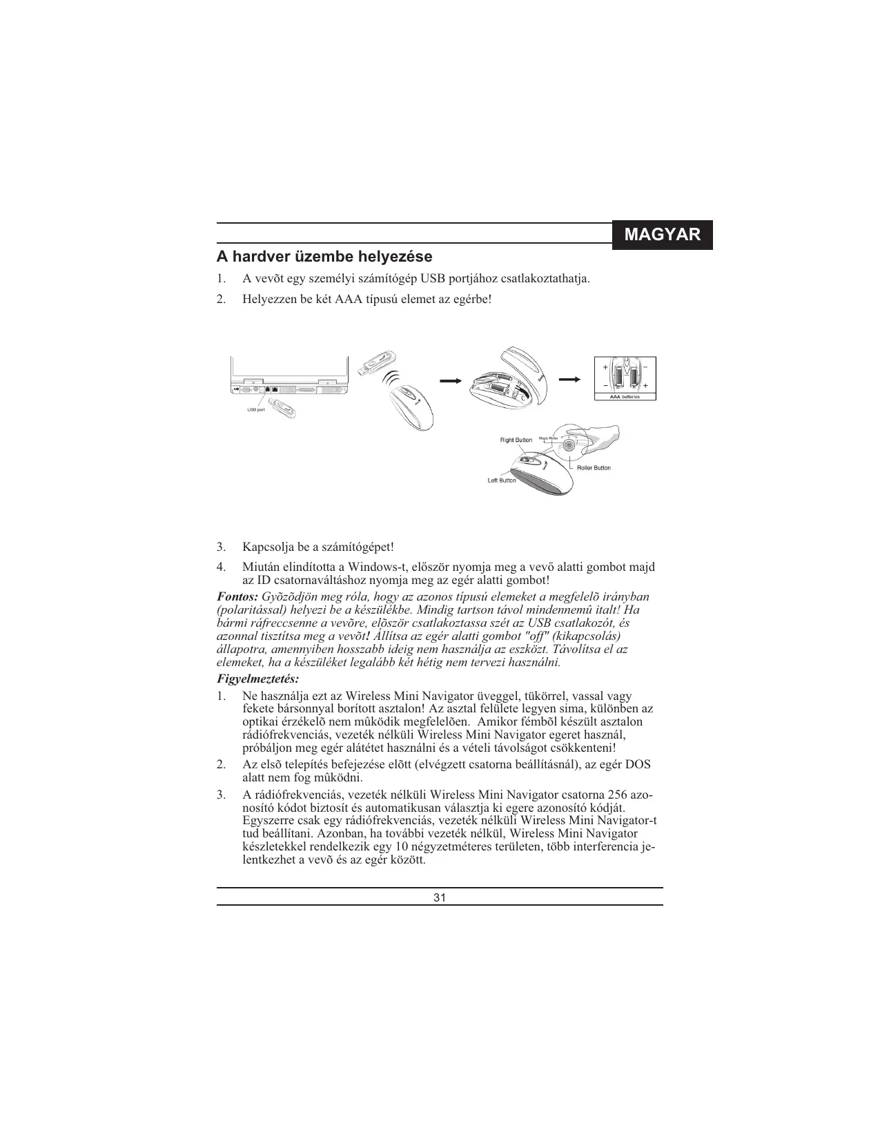 Miután elindította a Windows-t, elõször nyomja meg a vevõ alatti gombot majd az ID csatornaváltáshoz nyomja meg az egér alatti gombot! Fontos: Gyõzõdjön meg róla, hogy az azonos típusú elemeket a megfelelõ irányban (polaritással) helyezi be a készülékbe. Mindig tartson távol mindennemû italt! Ha bármi ráfreccsenne a vevõre, elõször csatlakoztassa szét az USB csatlakozót, és azonnal tisztítsa meg a vevõt! Állítsa az egér alatti gombot "off" (kikapcsolás) állapotra, amennyiben hosszabb ideig nem használja az eszközt. Távolítsa el az elemeket, ha a készüléket legalább két hétig nem tervezi használni. Figyelmeztetés: