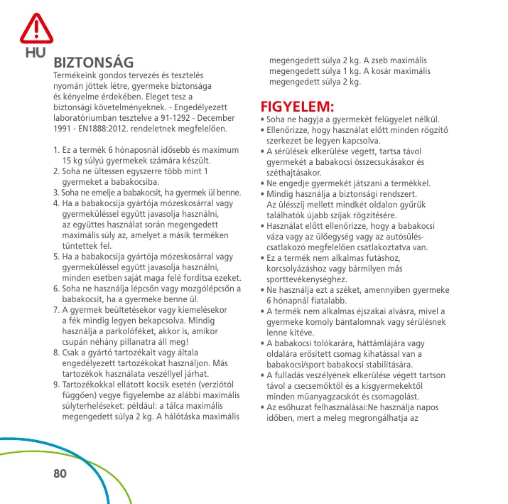 SK HU BIZTONSÁG Termékeink gondos tervezés és tesztelés nyomán jöttek létre, gyermeke biztonsága és kényelme érdekében. Eleget tesz a biztonsági követelményeknek. - Engedélyezett laboratóriumban tesztelve a 91-1292 - December 1991 - EN1888:2012. rendeletnek megfelelően. 1. Ez a termék 6 hónaposnál idősebb és maximum 15 kg súlyú gyermekek számára készült. 2. Soha ne ültessen egyszerre több mint 1 gyermeket a babakocsiba. 3. Soha ne emelje a babakocsit, ha gyermek ül benne. 4. Ha a babakocsija gyártója mózeskosárral vagy gyermeküléssel együtt javasolja használni, az együttes használat során megengedett maximális súly az, amelyet a másik terméken tüntettek fel. 5. Ha a babakocsija gyártója mózeskosárral vagy gyermeküléssel együtt javasolja használni, minden esetben saját maga felé fordítsa ezeket. 6. Soha ne használja lépcsőn vagy mozgólépcsőn a babakocsit, ha a gyermeke benne ül. 7. A gyermek beültetésekor vagy kiemelésekor a fék mindig legyen bekapcsolva. Mindig használja a parkolóféket, akkor is, amikor csupán néhány pillanatra áll meg! 8. Csak a gyártó tartozékait vagy általa engedélyezett tartozékokat használjon. Más tartozékok használata veszéllyel járhat. 9. Tartozékokkal ellátott kocsik esetén (verziótól függően) vegye figyelembe az alábbi maximális súlyterheléseket: például: a tálca maximális megengedett súlya 2 kg. A hálótáska maximális
