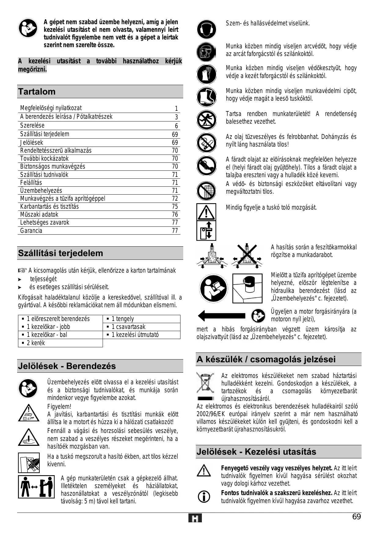 1 előreszerelt berendezés 1 kezelőkar - jobb 1 kezelőkar - bal 2 kerék 1 tengely 1 csavartasak 1 kezelési útmutató Jelölések - Berendezés Üzembehelyezés előtt olvassa el a kezelési utasítást és a biztonsági tudnivalókat, és munkája során mindenkor vegye figyelembe azokat. Figyelem! A javítási, karbantartási és tisztítási munkák előtt állítsa le a motort és húzza ki a hálózati csatlakozót! Fennáll a vágási és horzsolási sebesülés veszélye, nem szabad a veszélyes részeket megérinteni, ha a hasítóék mozgásban van. Ha a tuskó megszorult a hasító ékben, azt tilos kézzel kivenni. A gép munkaterületén csak a gépkezelő állhat. Illetéktelen személyeket és háziállatokat, haszonállatokat a veszélyzónától (legkisebb távolság: 5 m) távol kell tartani. Ügyeljen a motor forgásirányára (a motoron nyíl jelzi), mert a hibás forgásirányban végzett üzem károsítja az olajszivattyút (lásd az „Üzembehelyezés" c. fejezetet). A készülék / csomagolás jelzései Az elektromos készülékeket nem szabad háztartási hulladékként kezelni. Gondoskodjon a készülékek, a tartozékok és a csomagolás környezetbarát újrahasznosításáról. Az elektromos és elektronikus berendezések hulladékairól szóló 2002/96/EK európai irányelv szerint a már nem használható villamos készülékeket külön kell gyűjteni, és gondoskodni kell a környezetbarát újrahasznosításukról. Jelölések - Kezelési utasítás