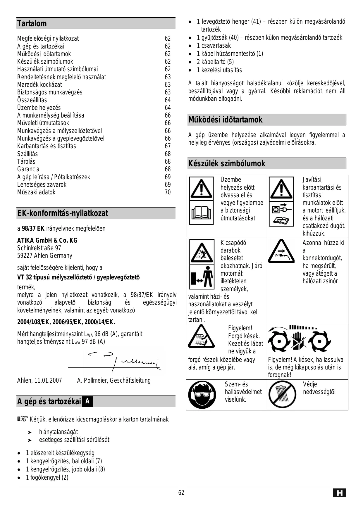 | Hangteljesitményszint LwA (2000/14/EG Mûszaki elöirások/sheint) | LwA 97 dB | Mört hangteljesitményszint 96 dB (A) garantált zajteljesitmény szint 97 dB (A) |