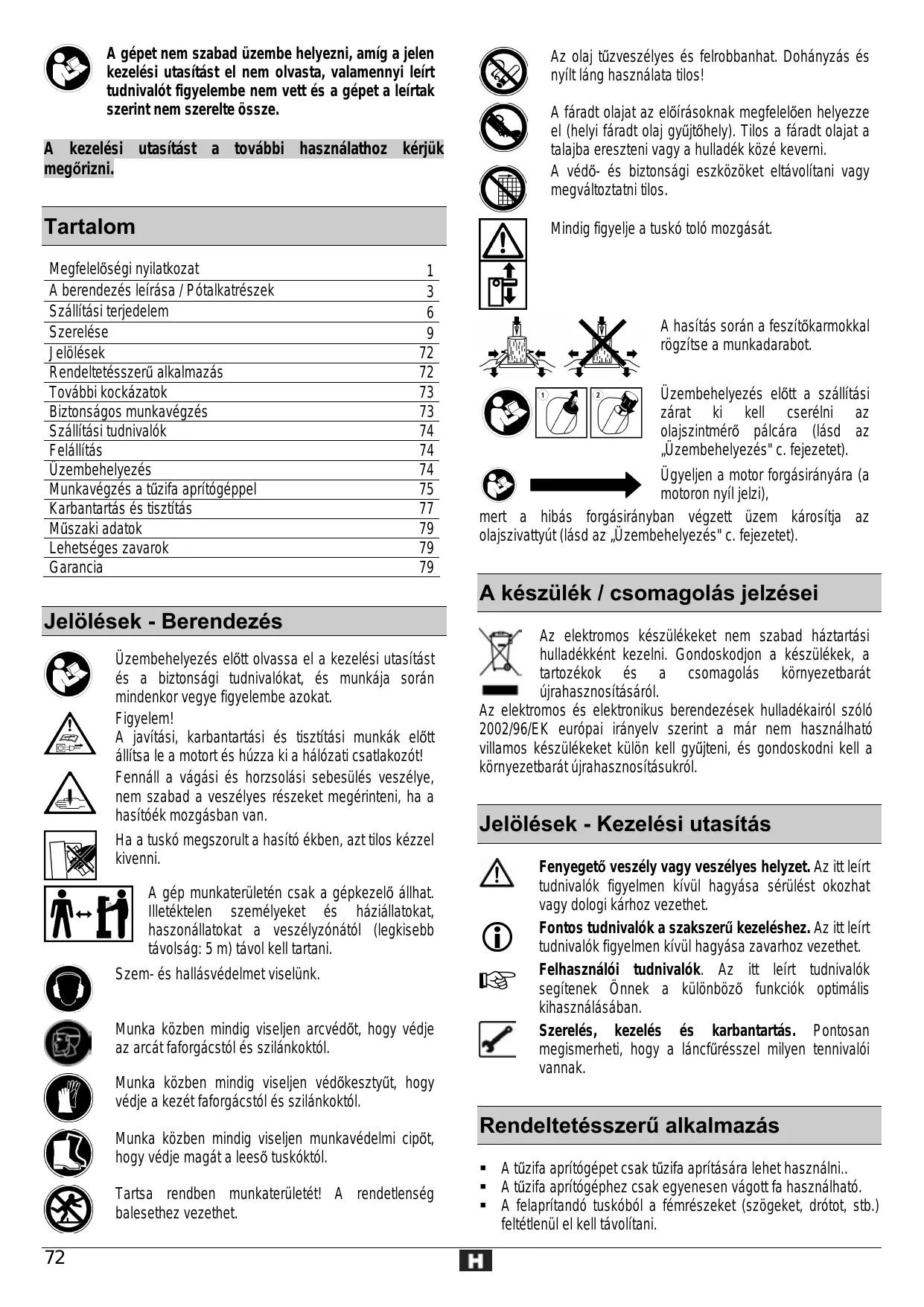 kezelési utasitäst el nem olvasta, valamennyi leirt tudnivalôt figyelembe nem vett és a gépet a leirtak szerint nem szerelte ôssze. (és A gépet nem szabad üzembe helyezni, amig a jelen A kezelési utasitäst a tovébbi hasznélathoz kérjük megôrizni, Tartalom Megfelelôségi nyilatkozat 1 À berendezés lefrésa / Pôtalkatrészek 3 Szällitési terjedelem 6 Szerelése 9 Jelolések 72 Rendeltetésszerü alkalmazäs 72 Tovébbi kockézatok 13 Biztonsägos munkavégzés 73 Széllitési tudnivalôk 14 Feléllités 14 Üzembehelyezés 14 Munkavégzés a tüzifa apritégéppel 75 Karbantarts és tisztités 17 Müszaki adatok 19 Lehetséges zavarok 19 Garancia 19 Az ola) tüzveszélyes és felrobbanhat. Dohänyzäs és nyilt lng hasznélata tilos! A féradt olajat az elbiräsoknak megfeleléen helyezze el (helyi féradt olaj gyüjtéhely). Tilos a féradt olajat a talajba ereszteni vagy à hulladé ék kôzé keverni. A védé- és biztonsägi eszkôzôket eltvolitani vagy megvältoztatni tilos. Mindig figyelje a tusk6 tolé mozgésät. À hasités sorén a feszitékarmokkal rôgzitse a munkadarabot. 7 2 —#,] Üzembehelyezés elôtt a szällitési (@) ; # zérat ki kel cserélni az olajszintméré pélcéra (lésd az Dzembehelyezés" c. fejezetet). Ügyeljen à motor forgäsiränyära (a motoron nyil jelzi), mert a hibés forgäsiränyban végzett üzem kérositja az olajszivattyüt (lésd az ,Üzembehelyezés" c. fejezetet). Jelôlések - Berendezés A készülék / csomagoläs jelzései Üzembehelyezés elôtt olvassa el a kezelési utasitäst és a biztonsägi tudnivalôkat, és munkäja sorén mindenkor vegye figyelembe azokat. Figyelem! A javitési, karbantartäsi és tisztitési munkäk elôtt éllitsa le a motort és hüzza ki a hélôzati csatlakozôt! Fennäll à vâgäsi és horzsolési sebesülés veszélye, nem szabad a veszélyes részeket megérinteni, ha a hasitoék mozgésban van. Ha a tuskô megszorult a hasité ékben, azt tilos kézzel kivenni. ®| À gép munkaterületén csak a gépkezelé ällhat. Illetéktelen személyeket és häzillatokat, haszonéllatokat a veszélyzénétôl (legkisebb tâvolsäg: 5 m) tévol kell tartani. Szem- és hallsvédelmet viselünk. Munka kôzben mindig viseljen arcvédôt, hogy védje az arcät faforgäcstôl és szilänkoktôl. © KP > Munka kôzben mindig viseljen védékesztyüt, hogy védje a kezét faforgäcstél és szilénkoktôl. Munka kôzben mindig viseljen munkavédelmi cipôt, hogy védje magât a leesé tusk6ktôl. Tartsa rendben munkaterületét! A rendetlenség balesethez vezethet. Az elektromos készülékeket nem szabad häztartési hulladékként kezelni. Gondoskodjon a készülékek, a tartozékok és a csomagolés kômyezetbarät = jjahasznositésérél. Az elektromos és elektronikus berendezések hulladékairôl sz616 2002/96/EK eurépai irényelv szerint à mér nem hasznélhaté vilamos készülékeket külôn kell gyüjteni, és gondoskodni kell a kômyezetbarât üjrahasznositäsukrôl. Jelôlések - Kezelési utasitâäs Fenyeget veszély vagy veszélyes helyzet. Az itt leirt tudnivalôk figyelmen kivül hagyäsa sérülést okozhat vagy dologi kérhoz vezethet. Fontos tudnivalék a szakszerü kezeléshez. Az itt leirt tudnivalék figyelmen kivül hagyäsa zavarhoz vezethet. Felhasznäléi tudnivalék. Az it leirt tudnivalék segitenek Onnek a külônbôzô funkciék optimälis Kihasznéléséban. N 56 à Szerelés, kezelés és karbantartäs. Pontosan megismerheti, hogy a léncfürésszel milyen tennivali vannak. Rendeltetésszerü alkalmazäs = A tüzifa apritgépet csak tüzifa apritésära lehet hasznälni.. = A tüzifa apritôgéphez csak egyenesen vägott fa hasznälhatô. = A felapritandé tuskébôl a fémrészeket (szôgeket, drôtot, stb.) feltétienül el kell tévolitani.