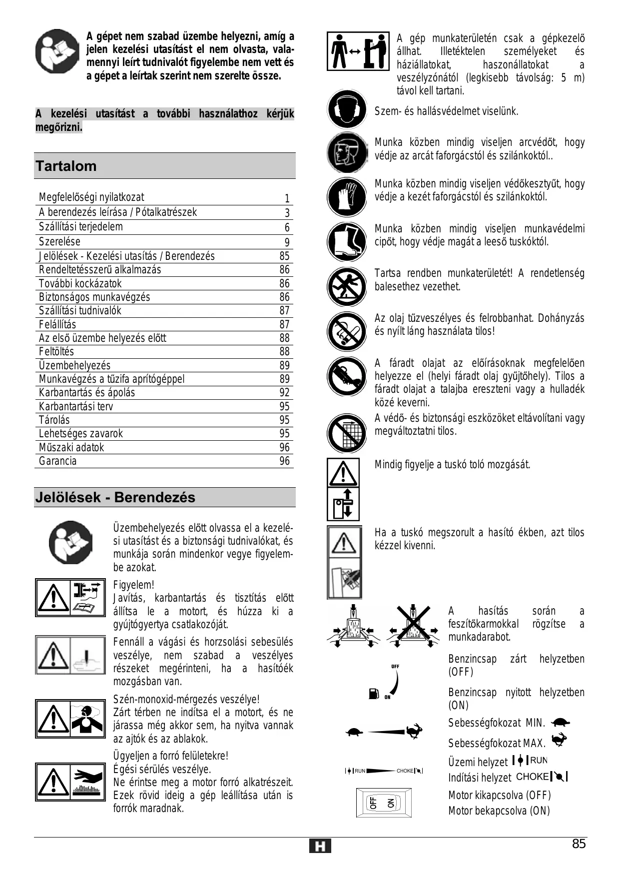 A gépet nem szabad üzembe helyezni, amig a jelen kezelési utasitést el nem olvasta, vala- mennyi leirt tudnivalôt figyelembe nem vett és a gépet a leirtak szerint nem szerelte ôssze. A kezelési utasitäst a toväbbi hasznälathoz kérjük megérizni. éllhat. Illetéktelen személyeket és héziéllatokat, haszonällatokat à veszélyzénätél (legkisebb tévolsäg: 5 m) tävol kell tartani. H A gép munkaterületén csak a gépkezelé Szem- és hallésvédelmet viselünk. . Munka kôzben mindig viseljen arcvédôt, hogy } védje az arcét faforgäcstôl és szilénkoktél.. Munka kôzben mindig viseljen védékesztyüt, hogy védje a kezét faforgäcstôl és szilänkoktél. Munka kôzben mindig viseljen munkavédelmi cipôt, hogy védje magét a leesé tuskéktél. balesethez vezethet. Az ola) tüzveszélyes és felrobbanhat. Dohänyzés és nyilt léng hasznélata tilos! © A féradt olajat az elôirésoknak megfeleléen helyezze el (helyi féradt olaj gyüjtéhely). Tilos a » À féradt olajat a talajba ereszteni vagy a hulladék kôzé keverni. A védé- és biztonsägi eszkôzôket eltvolitani vagy & Tartsa rendben munkaterületét! À rendetlenség Tartalom Megfeleléségi nyilatkozat 1 À berendezés leirésa / Pétalkatrészek 3 Széllitäsi terjedelem 6 Szerelése 9 Jelôlések - Kezelési utasitäs / Berendezés 85 Rendeltetésszerü alkalmazés 86 Tovébbi kockäzatok 86 Biztonsägos munkavégzés 86 Széllitäsi tudnivalôk 87 Feléllités 87 Az elsé üzembe helyezés elôtt 88 Feltôltés 88 Uzembehelyezés 89 Munkavégzés a tüzifa apritégéppel 89 Karbantartäs és épolés 92 Karbantartési terv 95 Térolés 95 Lehetséges zavarok 95 Müszaki adatok 96 Garancia 96 Jelôlések - Berendezés Üzembehelyezés elôtt olvassa el à kezelé- si utasitäst és à biztonségi tudnivalôkat, és munkéja sorén mindenkor vegye figyelem- be azokat. > Figyelem! el Javités, karbantartés és tisztités elôtt 27 |] élitsa le à motort, és hüzza ki a gyüjtégyertya csatlakozéjät. Fennäll à vâgési és horzsoläsi sebesülés veszélye, nem szabad à veszélyes részeket megérinteni, ha a hasitéék mozgésban van. Szén-monoxid-mérgezés veszélye! Zärt térben ne inditsa el a motort, és ne jérassa még akkor sem, ha nyitva vannak az ajtôk és az ablakok. Ügyeljen a for felületekre!